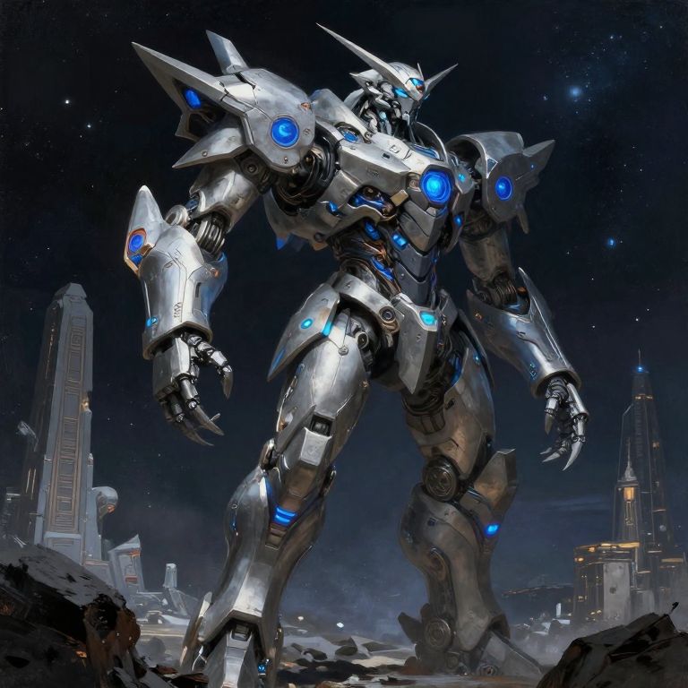 CGI sci-fi image of a towering, silver robotic warrior with blue glowing accents, standing in a futuristic, star-studded cityscape.
