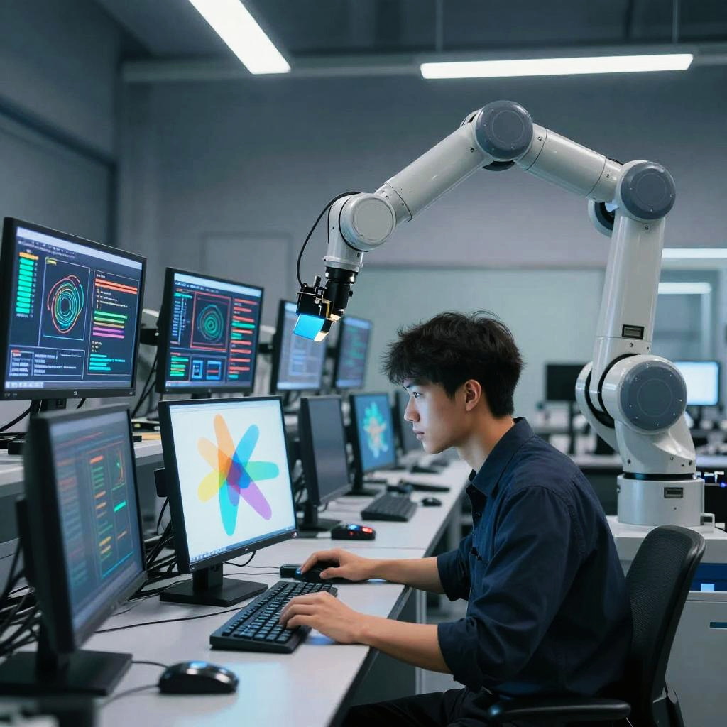 Braces generator illustrating an automated robot applying braces on a smiling patient inside a futuristic dental clinic, digital screens showing progress, brushed steel and glass surfaces, vibrant colors, highly detailed and immersive scene