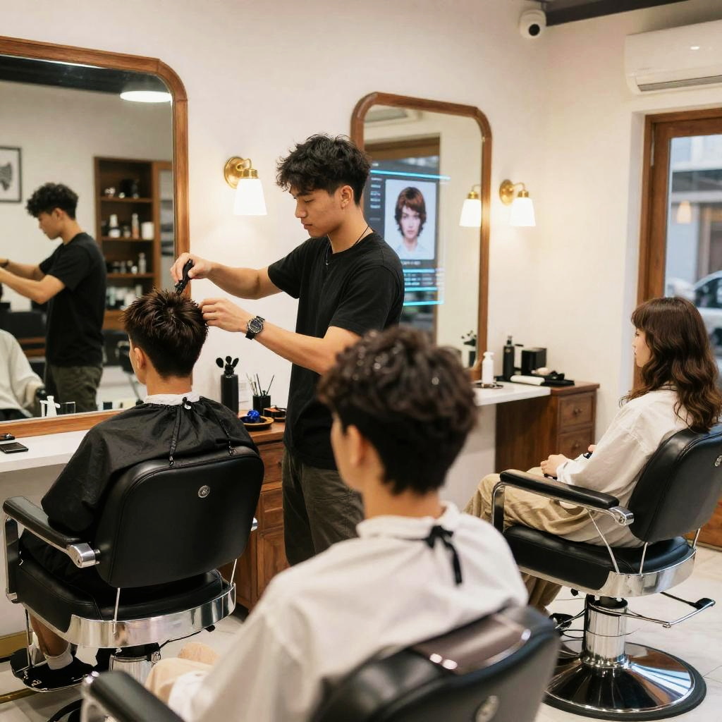Hairstyle creator at work, traditional barber shop mixed with digital holograms displaying hair designs, warm natural lighting, diverse male and female clients, detailed hair textures, cozy artistic environment, mid-century modern style