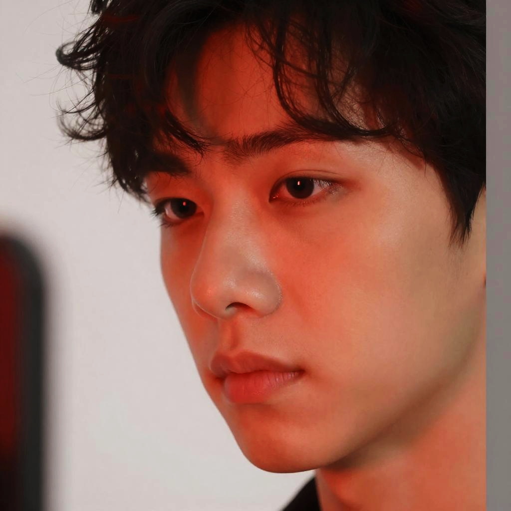 This is a close-up, digital, highly saturated photograph of a young person with a light complexion and short, dark, slightly curly hair. The image is dominated by bright red and orange hues, with a stark white background on the left side and a gray border on the right. The person's eye is visible, looking slightly off-camera, with a shadowy object in the left foreground.