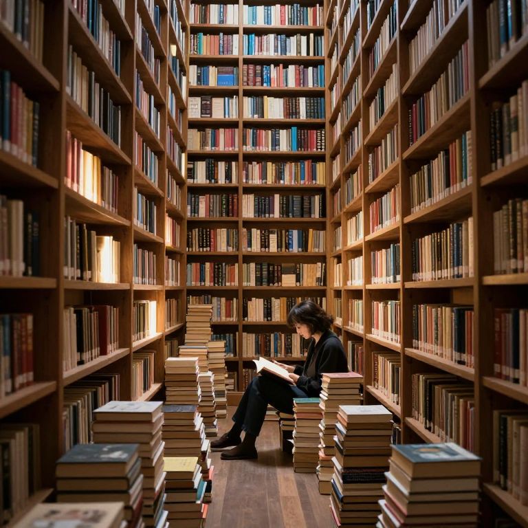 Photograph of a solitary person with dark hair, wearing black, sitting amidst tall, wooden bookshelves filled with colorful books, surrounded by stacks of
