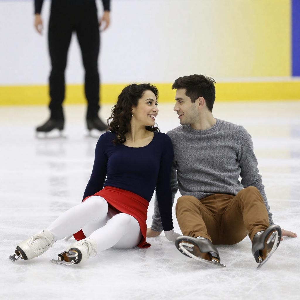 Two skaters lying on the ice. Woman with dark curly hair, navy top, red skirt, white pants, and silver skates leans over a man with short dark hair, grey sweater, brown pants, and silver skates. Both smiling, intense eye contact. Background has yellow and white patterned barrier. Another skater's legs visible in the background.