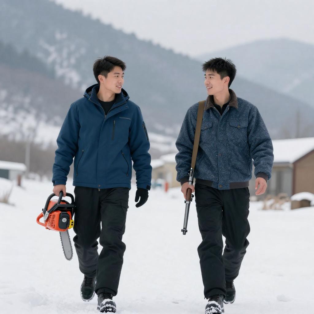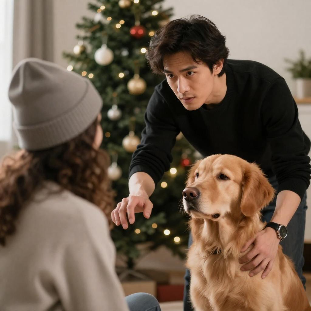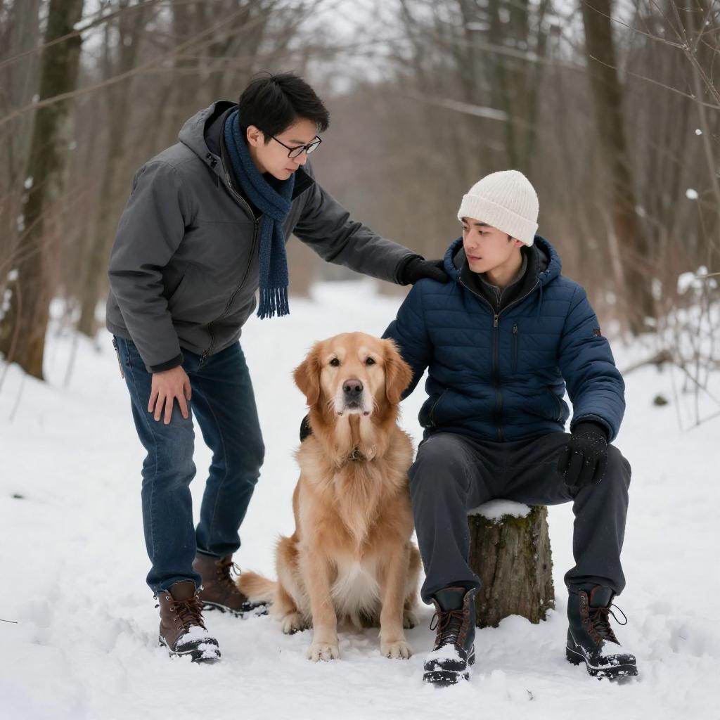 Photograph of two men and a golden retriever in a snowy forest. One man, wearing glasses, a gray jacket, and a blue scarf, reaches out to touch the other man's shoulder. The second man, in a blue quilted jacket and white beanie, sits with legs apart. The golden retriever sits between them. Both men wear dark pants and boots. The background shows bare trees and snow. The man in gray looks at the other man, who gazes forward.