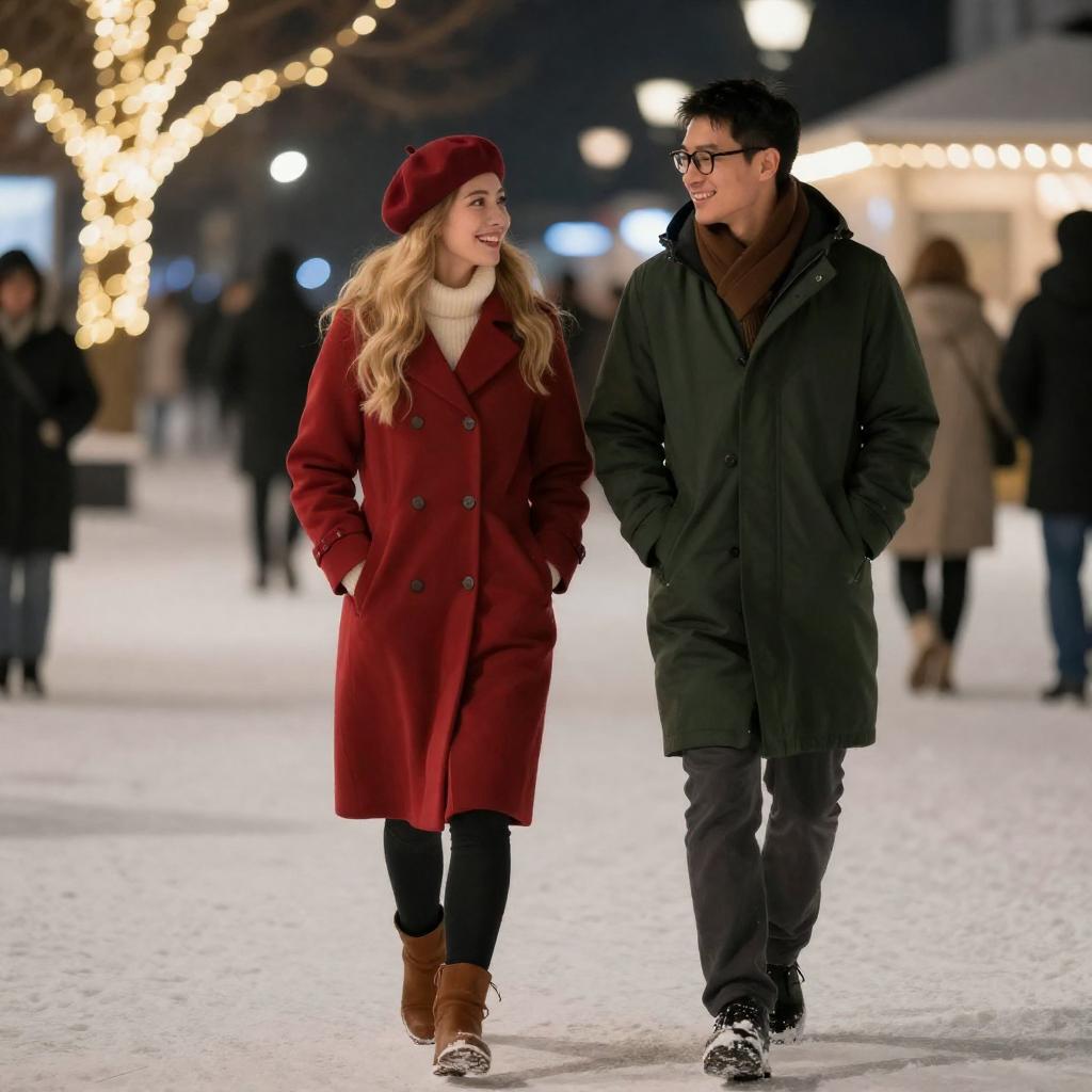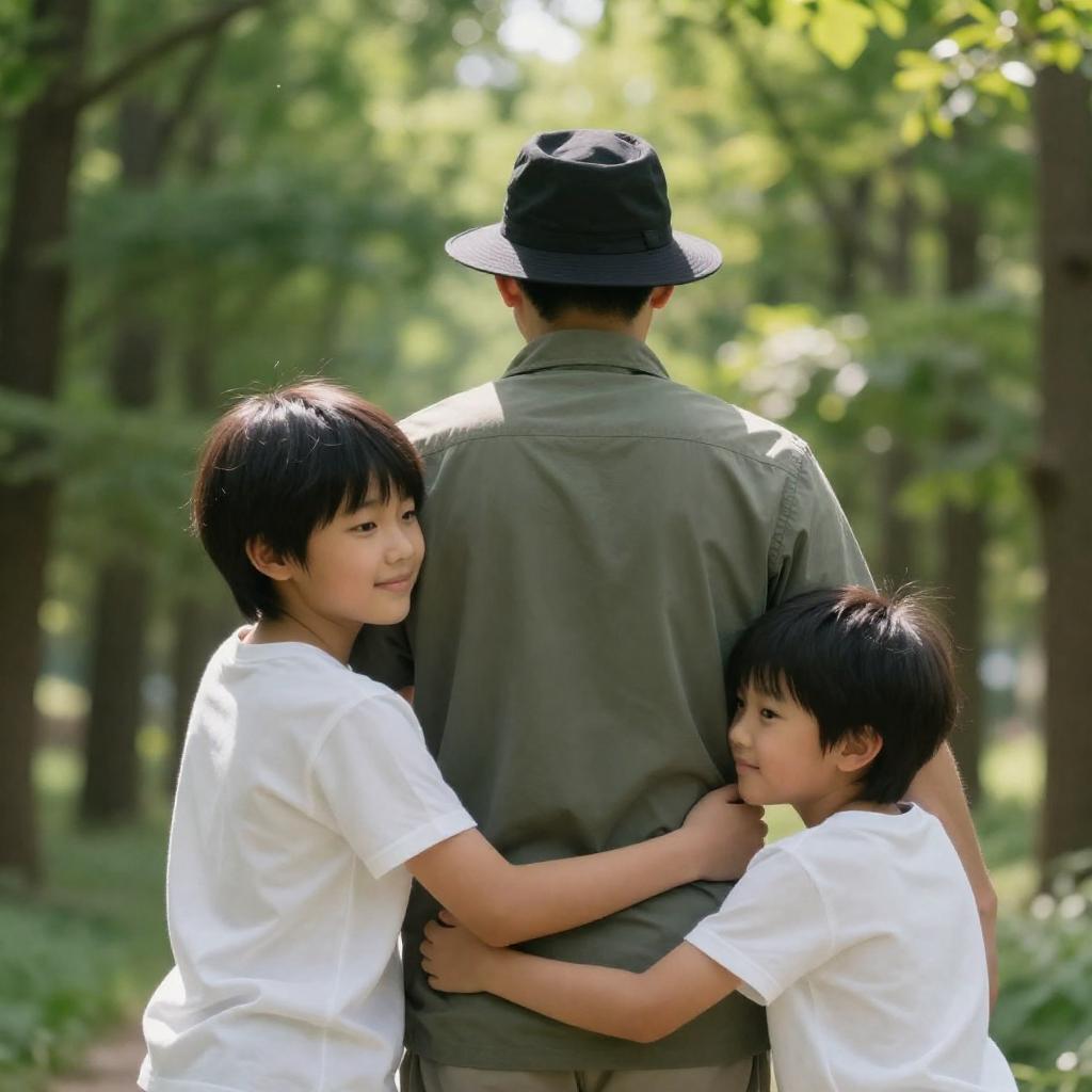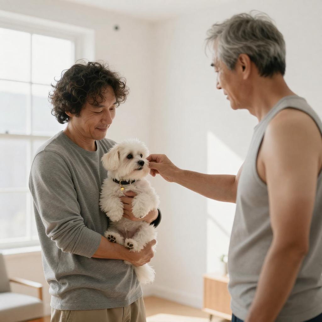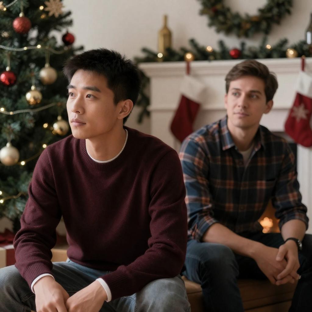 Photograph of two men and a golden retriever in a snowy forest. One man, wearing glasses, a gray jacket, and a blue scarf, reaches out to touch the other man's shoulder. The second man, in a blue quilted jacket and white beanie, sits with legs apart. The golden retriever sits between them. Both men wear dark pants and boots. The background shows bare trees and snow. The man in gray looks at the other man, who gazes forward.