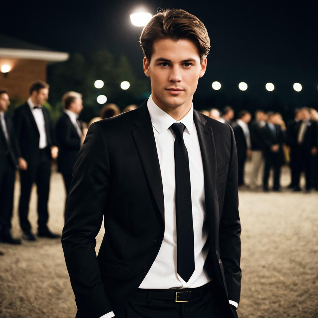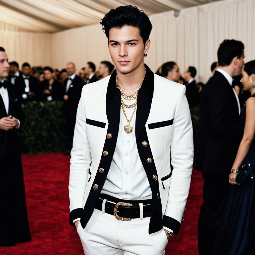 Met gala outfit male,male focus, 1boy, realistic, belt, black hair, solo focus, jewelry, pants, jacket, closed mouth, necklace, shirt, white shirt, standing, buttons