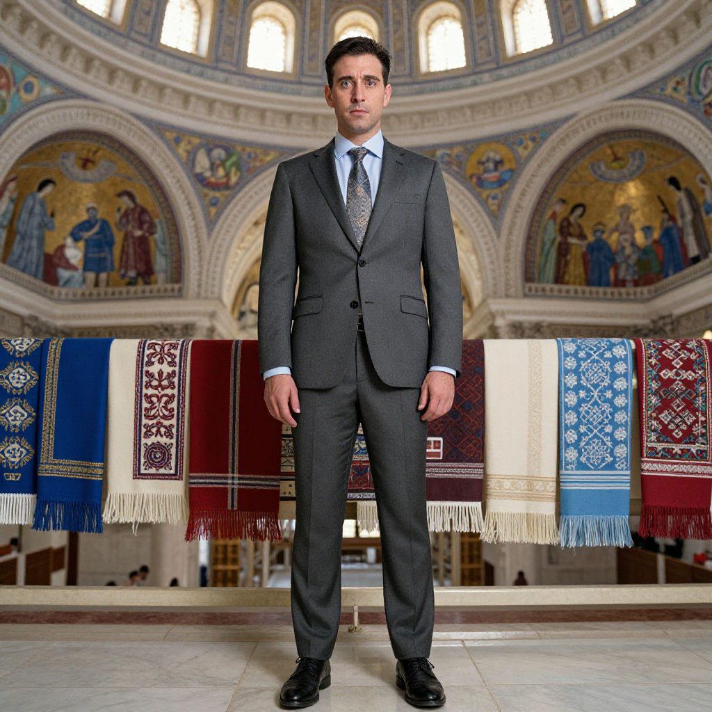 A man, charcoal gray suit, light blue dress shirt, patterned silk tie, black wingtip shoes, standing in a grand dome ceiling, intricate mosaics, vibrant prayer shawls, Holga camera style, contemplative expression. Man has masculine face and piercing eyes