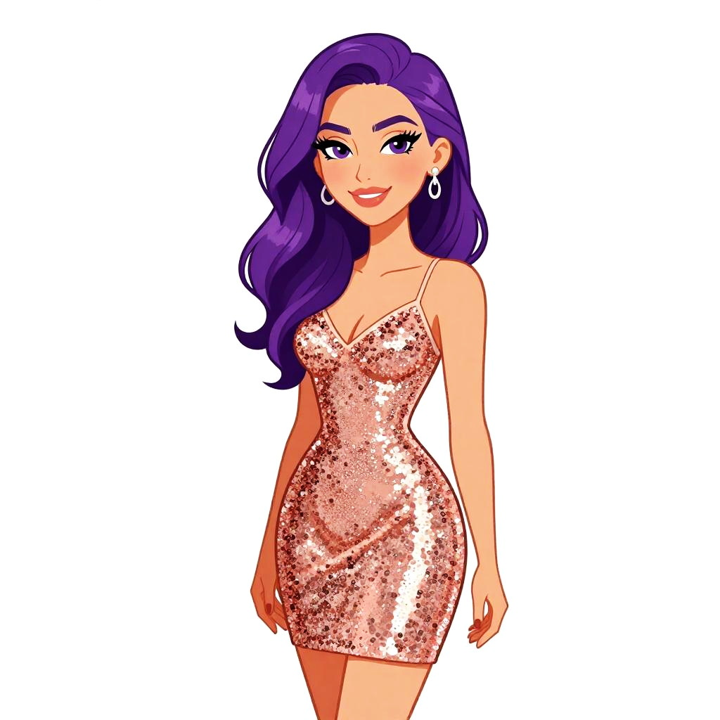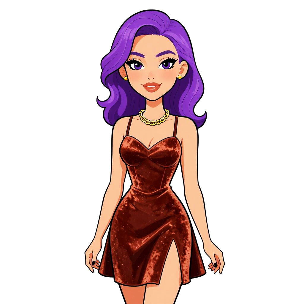 Woman with pretty face and pretty hair. smiling Woman, velvet party dress in rich copper tone, cami straps, sweetheart neckline, fitted bodice with a slight twist detail, flared skirt, thigh-length, chunky gold chain necklace, white seamless background --sref 1467