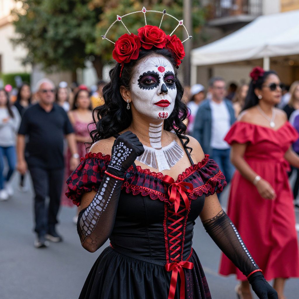 Photograph of a woman in a Day of the Dead costume, standing on a busy street. She has a white face mask with black decorative patterns, red lipstick, and dark, wavy hair adorned with red roses. She wears a black, lace-trimmed dress with red ribbons and red accents, and raises her right arm in a triumphant pose. The background shows blurred pedestrians, some in red and black attire, and buildings with white and brown facades. The image has vibrant colors and a slightly blurred bokeh effect, emphasizing the subject.