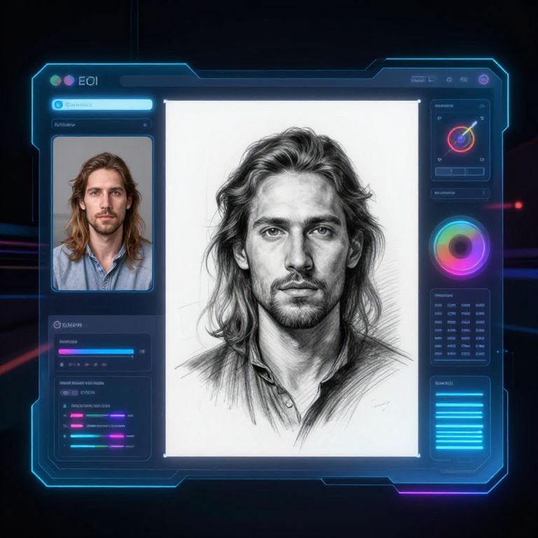 A creative scene featuring apps that turn pictures into drawings on a holographic display, where a realistic portrait morphs into a stunning charcoal drawing, surrounded by futuristic UI elements, neon lights, and a dark artistic background.