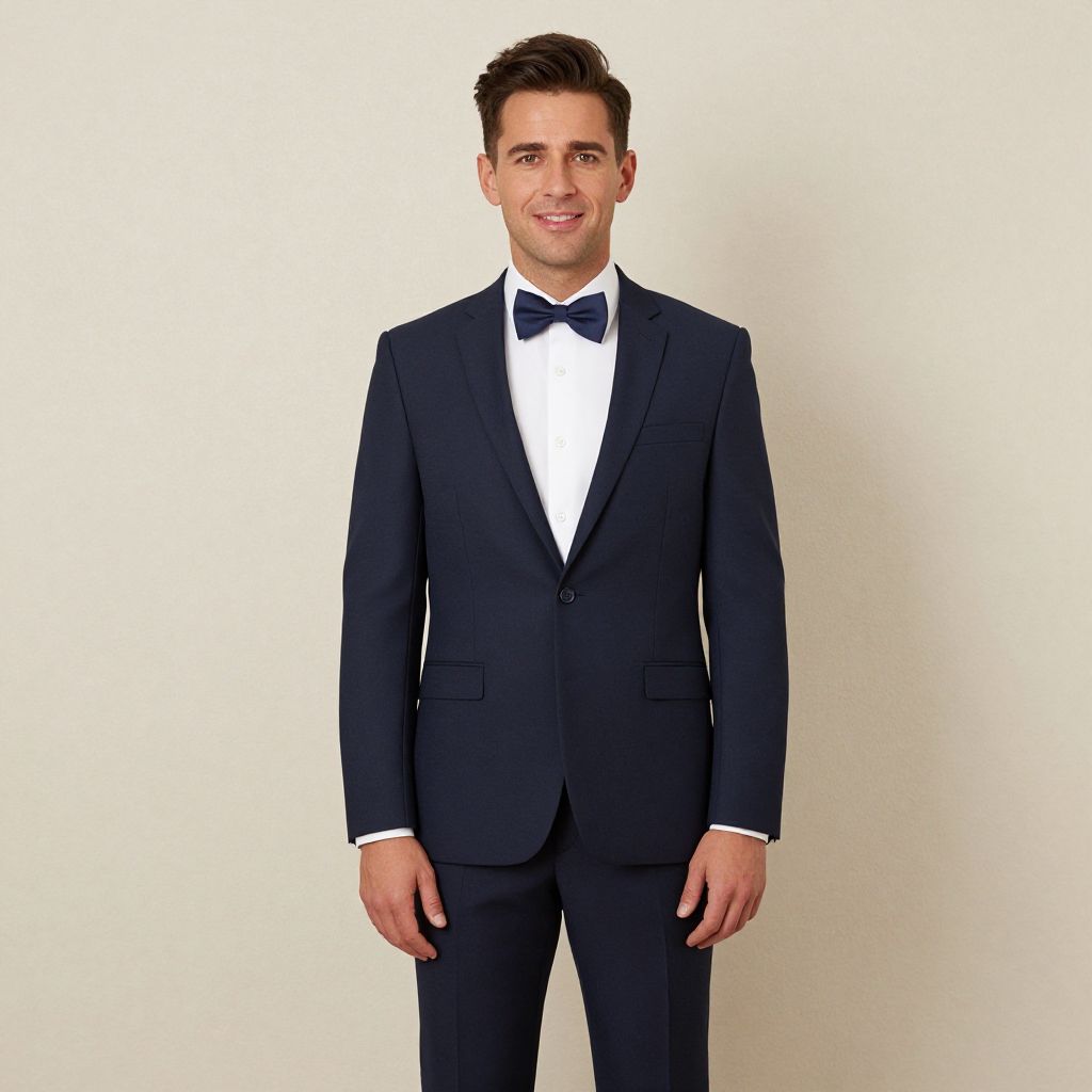 Photograph of a young man with short, dark brown hair, standing against a plain white background. He is wearing a dark navy blue tuxedo with a white dress shirt and a black bow tie. He has a light skin tone and is smiling slightly. His physique is average, and his hands rest by his sides. The tuxedo is well-fitted, highlighting a formal and stylish appearance. The lighting is even, with no visible shadows, emphasizing the clean and simple composition of the image.