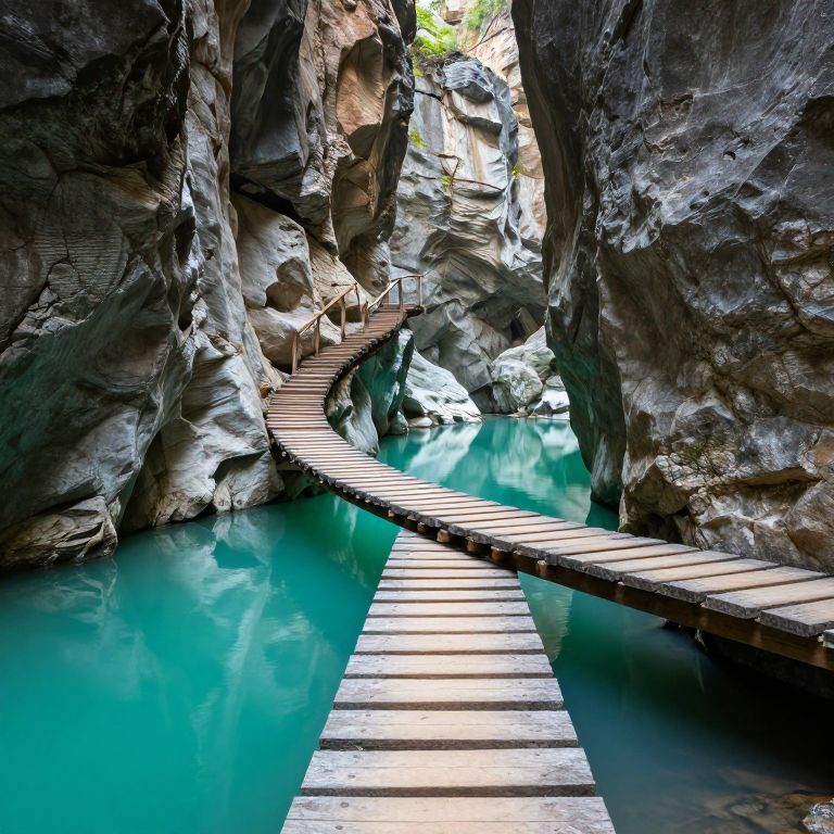 Suspended wooden steps ascend gracefully through a narrow canyon, bridging towering rock walls above a serene turquoise lagoon that mirrors the ethereal beauty of the scene.