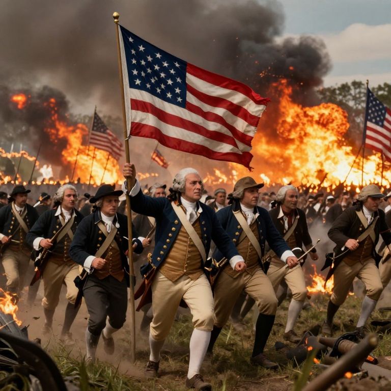 Photograph of Revolutionary War soldiers in 18th-century uniforms, carrying American flags, charging forward amidst intense battlefield fires and smoke.