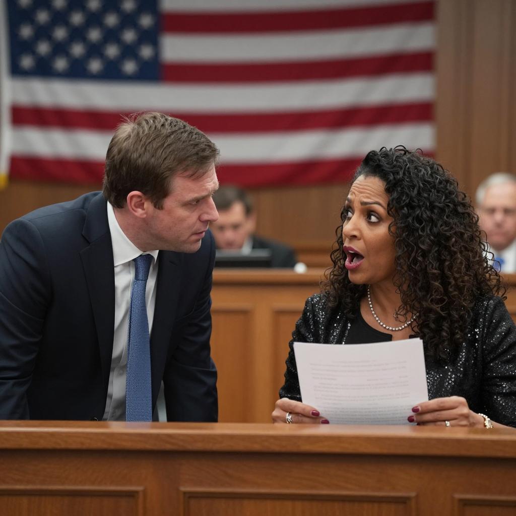 Photograph of a courtroom scene with two people. Man in dark suit, white shirt, and tie leaning forward, looking at woman. Woman with curly black hair, black sequined top, holding paper, mouth open in mid-speech. American flag in background. Wooden paneling and podiums. Woman on right, man on left. Intense expressions.