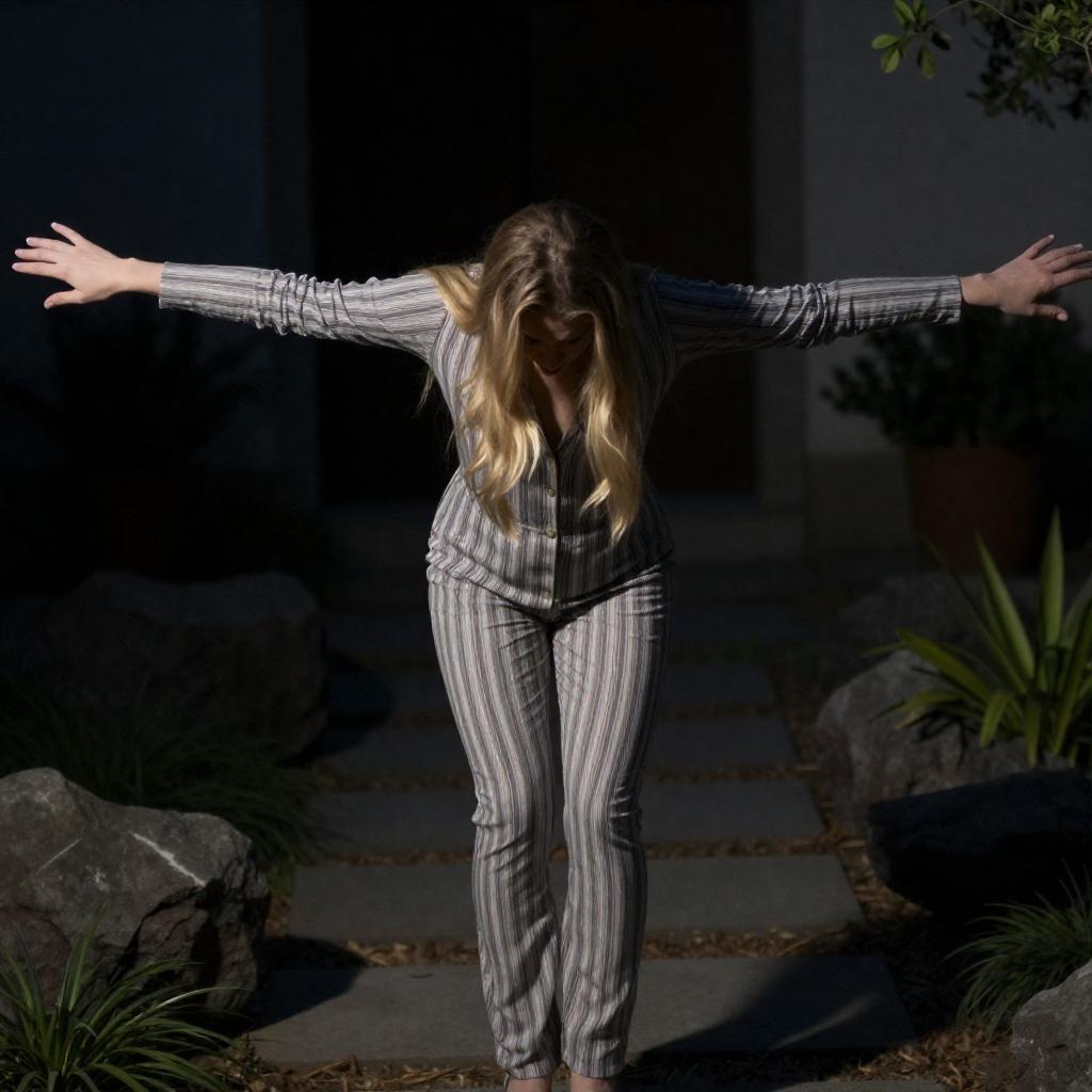 Photograph of a woman with long blonde hair, wearing a striped, long-sleeve jumpsuit, leaning forward with arms outstretched. She is in a dimly lit garden with rocks, plants, and a stone path. The background includes a blurred, dark structure. The lighting creates dramatic shadows, highlighting her figure and the ures around her.