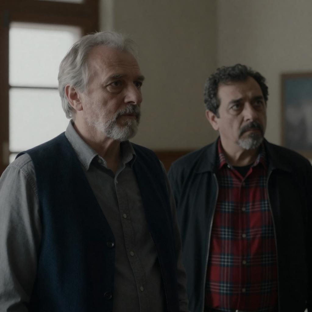 Photograph of two older men standing indoors. The man on the left has gray hair, a beard, wears a dark vest over a gray shirt, looks to the side. The man on the right has dark hair, a goatee, wears a red plaid shirt under a black jacket, looks ahead with a serious expression. Dimly lit room with a window in the background.