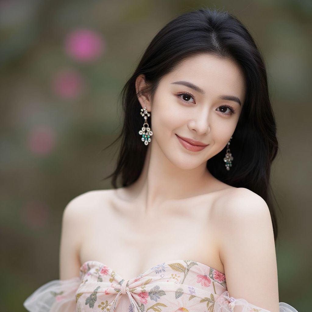 This is a digitally created CGI image of an Asian woman with fair skin and red hair in a ponytail. She is smiling gently and holding two large, green watermelons with dark green stripes in her hands. She is wearing a sleeveless, striped dress with colors including blue, yellow, orange, and red. The background is blurred, showing green foliage and a hint of a wooden structure. The woman's makeup is subtle, with pink lipstick and light eye makeup. The image has a bright, vibrant color palette and a soft focus on the subject.