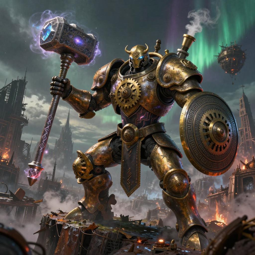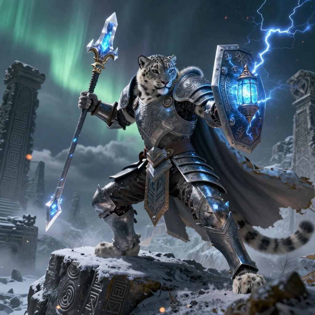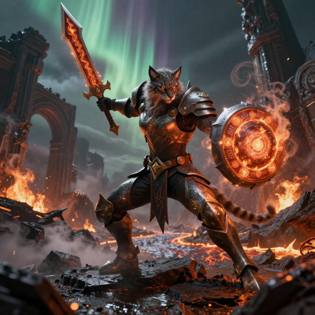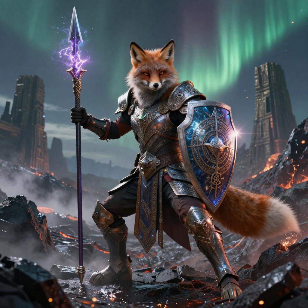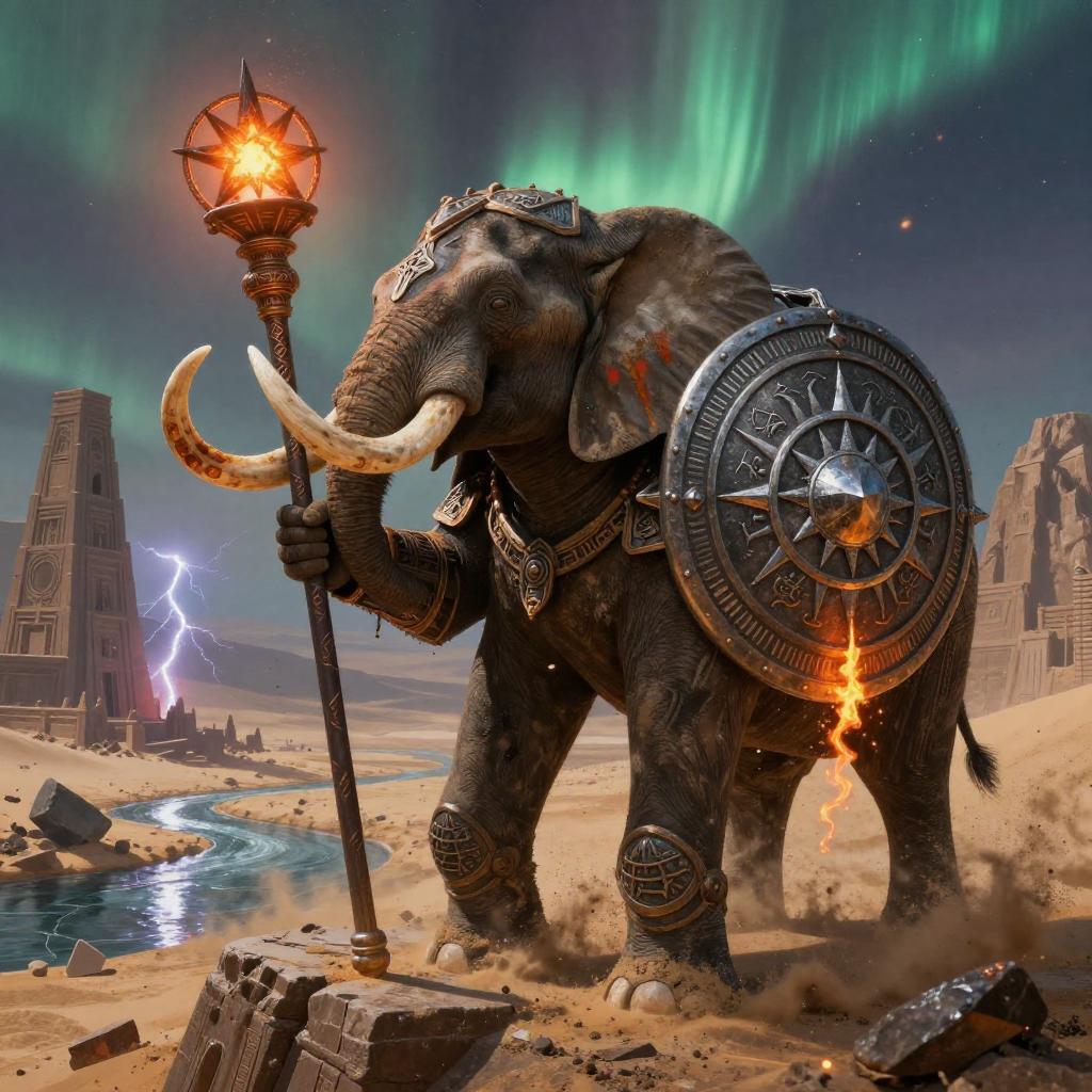 Armored elephant battle-mage wearing rune-embossed barding and amber-inlaid tusk-plates, ceremonial warped-cloth draped from massive pauldrons, ritual paint streaks and realistic mud-streaked hide, towering runed ank-staff crowned with a burning star-forge lantern and spiraling molten runes, and a colossal obsidian tusk-shield engraved with solar-and-storm sigils trailing ember-sparks, ember-strewn sandstone precipice above a shattered desert ziggurat and a river of molten glass, dusk aurora-streaked sky with distant lightning pillars, drifting ash and scorched sand whirlwinds, dramatic lighting, dynamic pose, dynamic camera, dark shadows, volumetric rays, rim light, sparks and embers, weather particles, wet surfaces and reflections, intricate runes, realistic fur and metals, masterpiece, best quality, ultra-detailed, 8k uhd, photoreal accents, high contrast, depth of field, lens flare, global illumination, crisp hard shadows, cinematic composition, epic mood