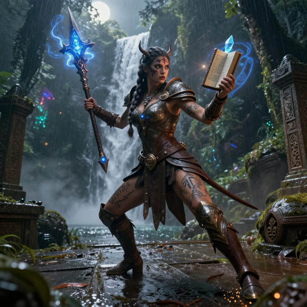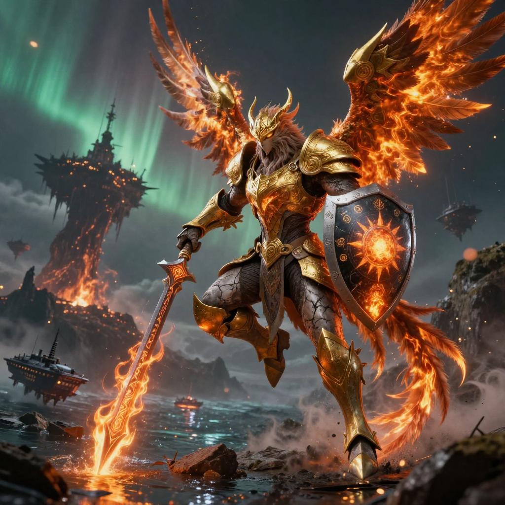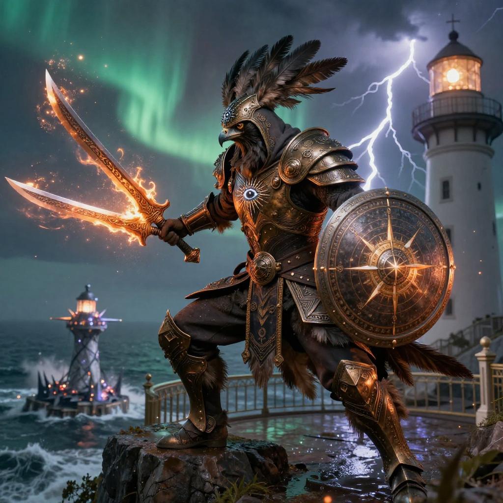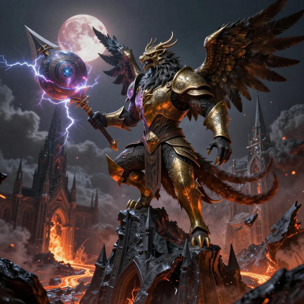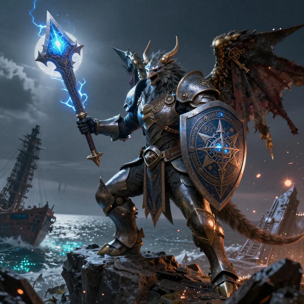 Armored elephant battle-mage wearing rune-embossed barding and amber-inlaid tusk-plates, ceremonial warped-cloth draped from massive pauldrons, ritual paint streaks and realistic mud-streaked hide, towering runed ank-staff crowned with a burning star-forge lantern and spiraling molten runes, and a colossal obsidian tusk-shield engraved with solar-and-storm sigils trailing ember-sparks, ember-strewn sandstone precipice above a shattered desert ziggurat and a river of molten glass, dusk aurora-streaked sky with distant lightning pillars, drifting ash and scorched sand whirlwinds, dramatic lighting, dynamic pose, dynamic camera, dark shadows, volumetric rays, rim light, sparks and embers, weather particles, wet surfaces and reflections, intricate runes, realistic fur and metals, masterpiece, best quality, ultra-detailed, 8k uhd, photoreal accents, high contrast, depth of field, lens flare, global illumination, crisp hard shadows, cinematic composition, epic mood