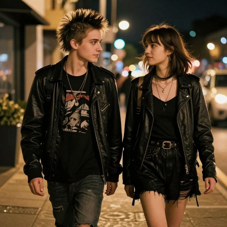 Awe-Inspiring a teenage punk rocker guy going on a date with a teenage punk rocker girl, walking down the street at night,