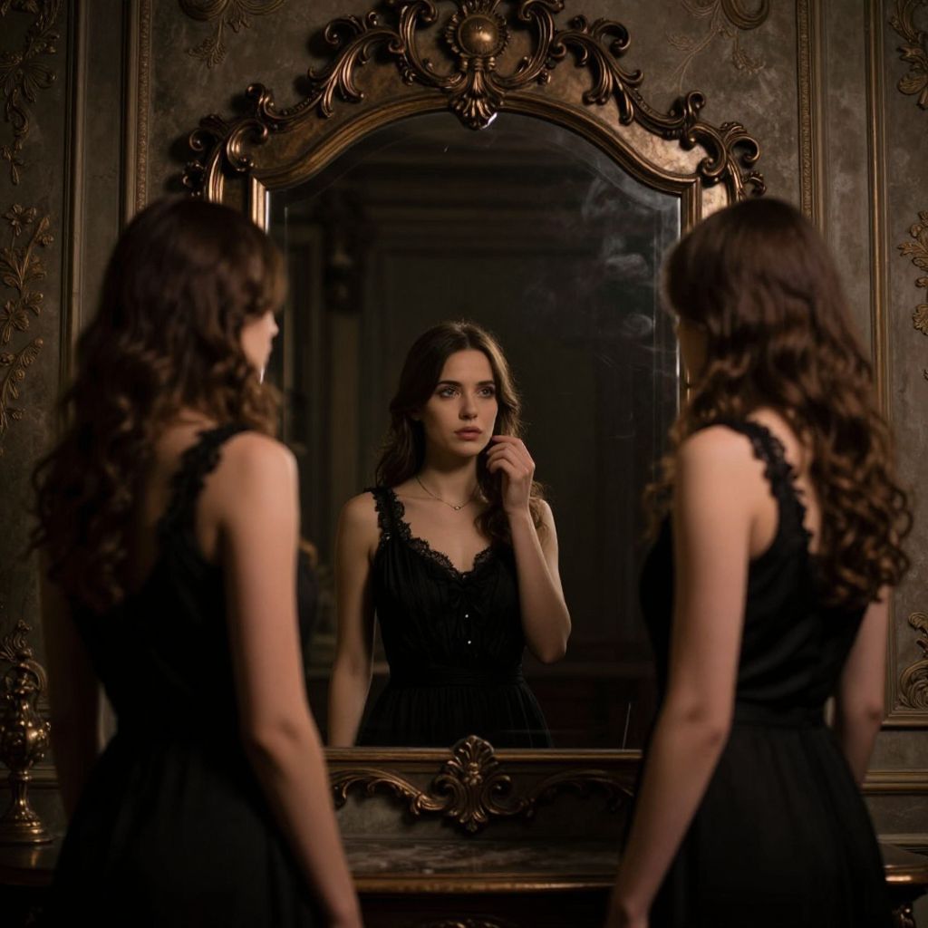 In a dimly lit chamber, a woman stands before an ornate mirror, her reflection multiplied into two distinct forms, each mirroring her pose yet defying the laws of optics, as if her identity fractures into parallel realities.