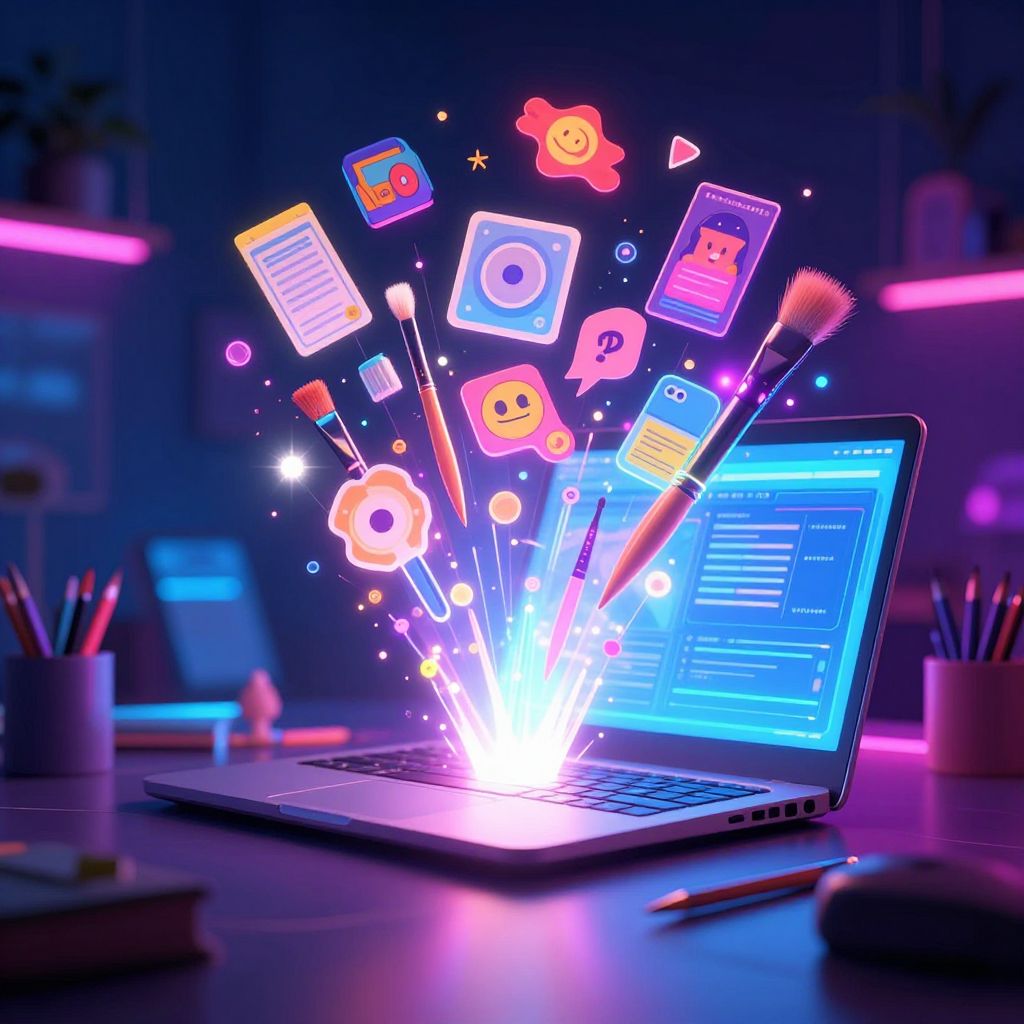 Clipart generator as a magical digital studio, with glowing brushes and floating clipart elements emerging from a laptop, surreal neon lighting, cyberpunk-inspired colors and atmosphere, combining creativity and futuristic design