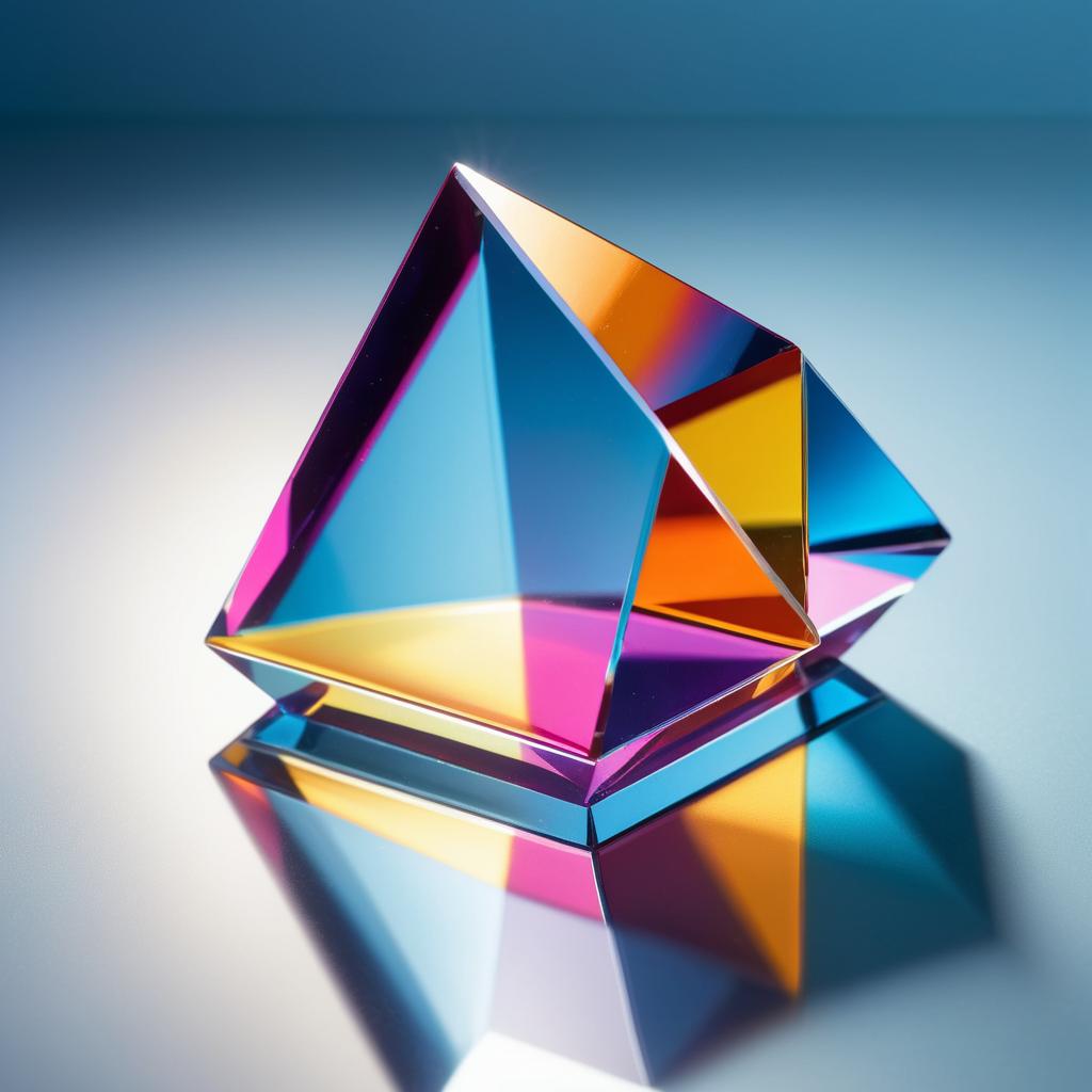 A clear geometric glass prism standing on a reflective surface, light passing through it creating vibrant multicolored reflections mainly in blue, orange, pink and yellow hues, modern minimalistic style, smooth and glossy textures, sharp edges and transparent material, soft neutral background, studio lighting