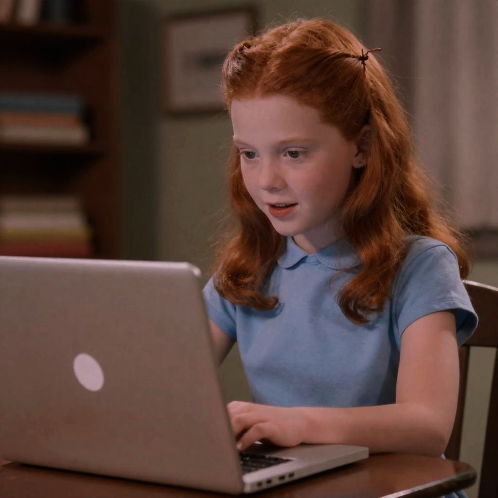 Little Orphan Annie, young girl with red hair looking at a laptop