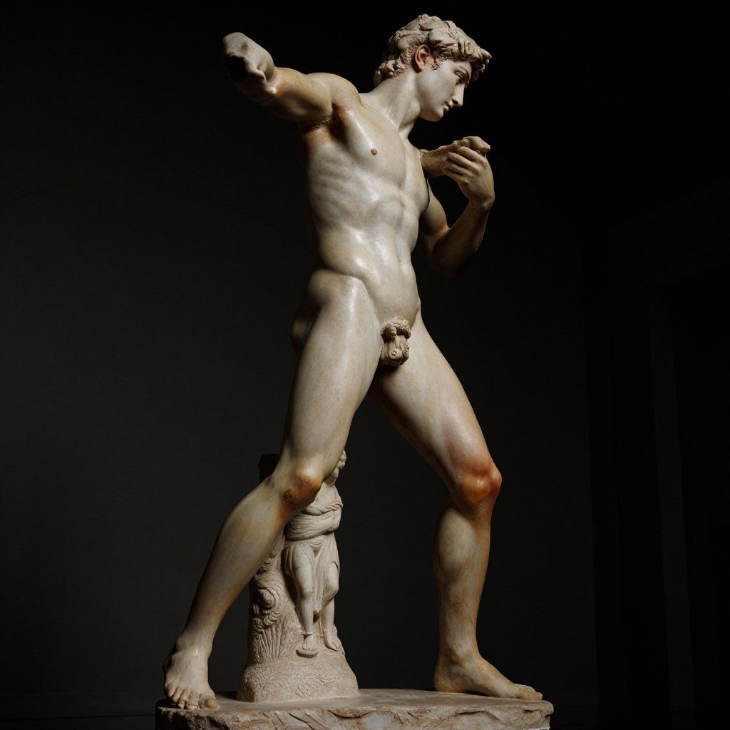 Photograph of a classical marble statue depicting a nude male figure standing in a dynamic pose. The figure, with defined musculature, curly hair, and a prominent, uncircumcised penis, is reaching forward with his right arm while his left arm is bent at the elbow. He stands on a decorative pedestal with intricate carvings. The statue's smooth, polished marble surface reflects light, highlighting its contours against a stark black background. The detailed craftsmanship and realistic proportions suggest the statue is inspired by classical Greek or Roman art. The lighting emphasizes the statue's three-dimensional form and sculptural details.