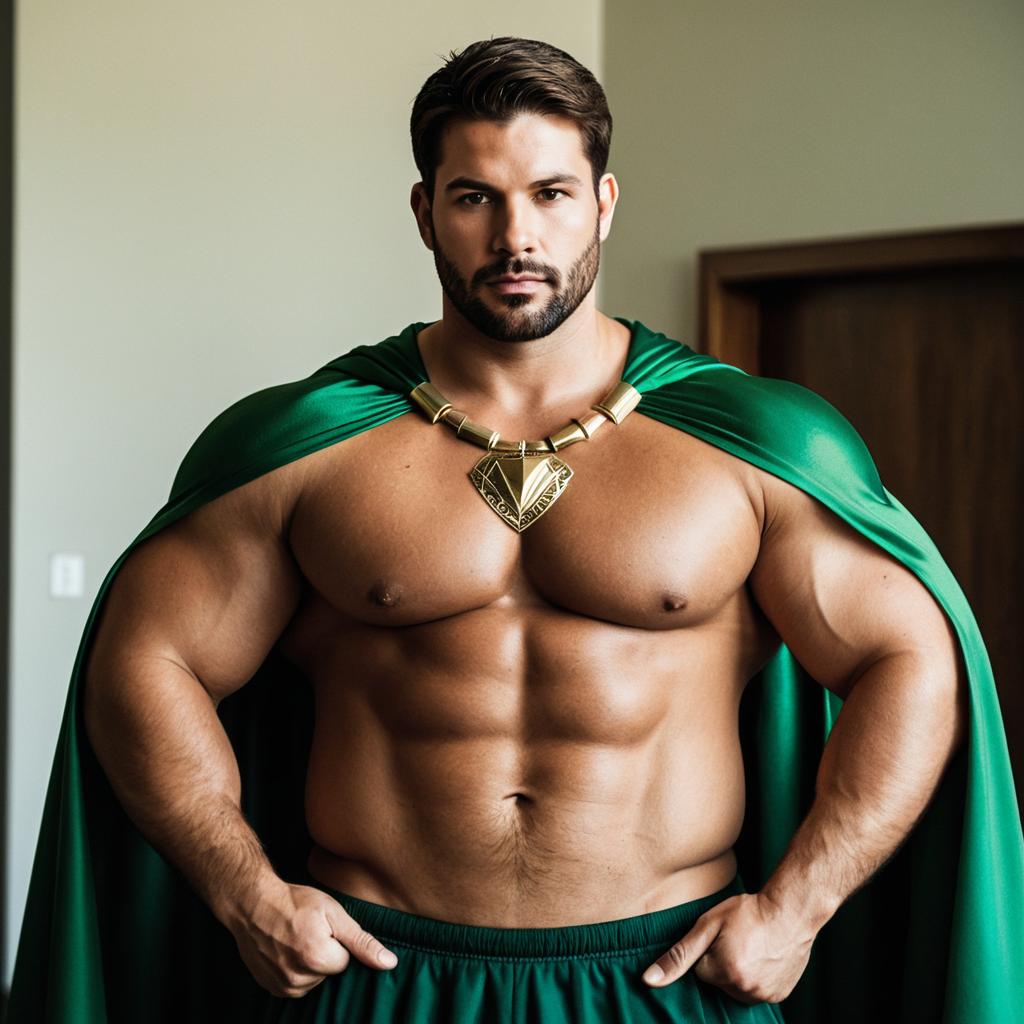 Plus size man costume fancy ,male focus, 1boy, solo, bara, pectorals, navel, muscular male, nipples, short hair, muscular, cape, large pectorals, looking at viewer, facial hair, indoors, brown hair, green cape, jewelry