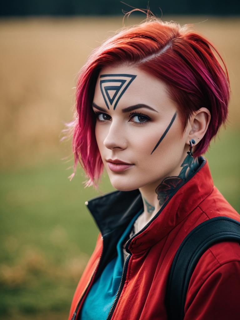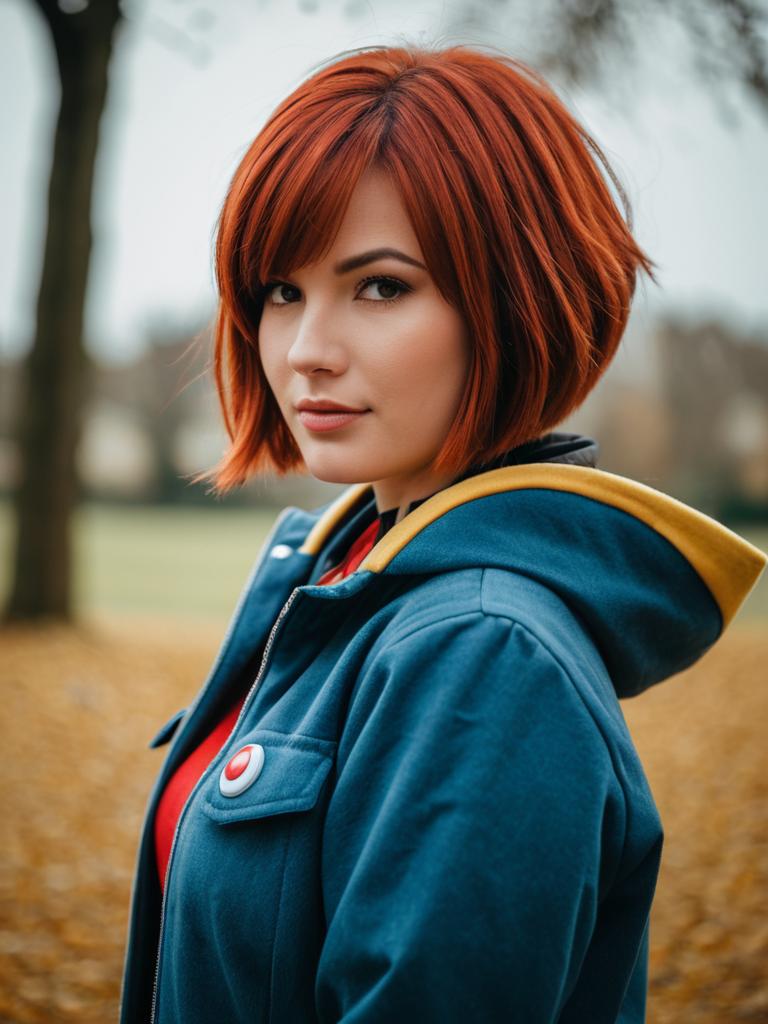 Photo-realistic cosplay photo of person in arezu (pokemon) costume. 1girl, red eyes, short hair, red hair, brown hair, collarbone, diamond clan outfit, jacket, long sleeves, cowlicklifestyle stock photo, shallow depth of field, lifestyle stock photography, shallow depth of field, natural lighting, warm tones, soft background blur, candid moments, vibrant colors, realistic textures, modern casual clothing. full body shot