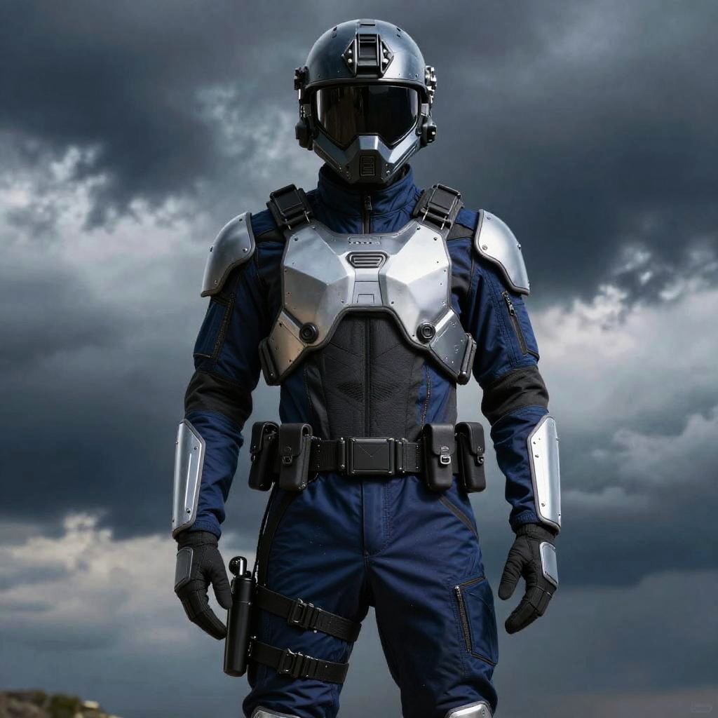 Create a uniform design inspired by futuristic military aesthetics, featuring sleek armored textures, bold color contrasts in navy and silver, intricate utility belts, and a high-tech helmet under a dramatic stormy sky, emphasizing functionality and advanced technology.