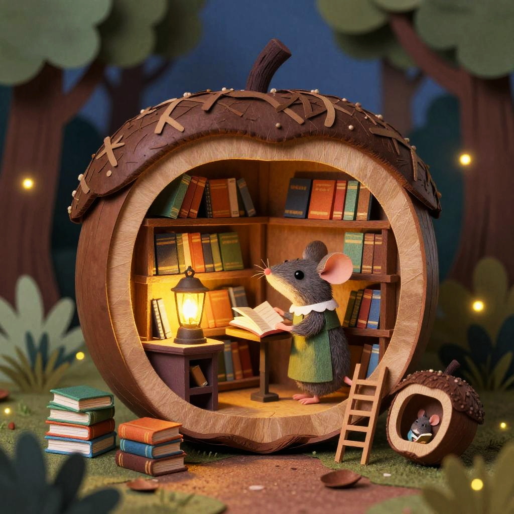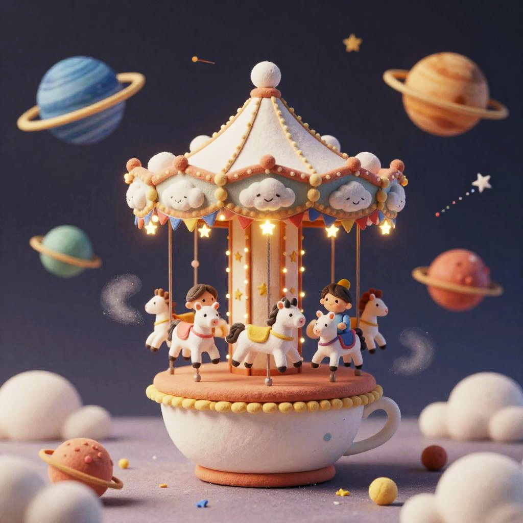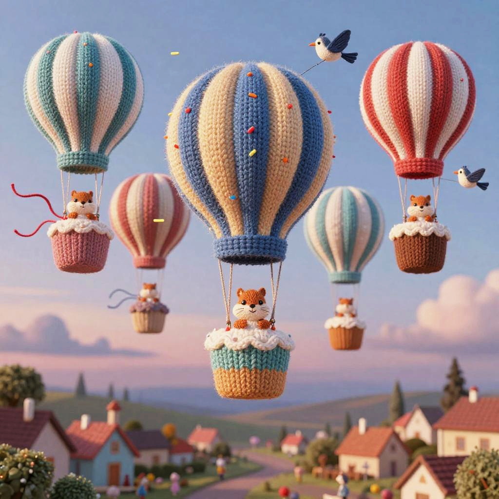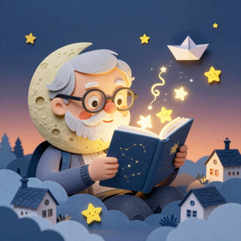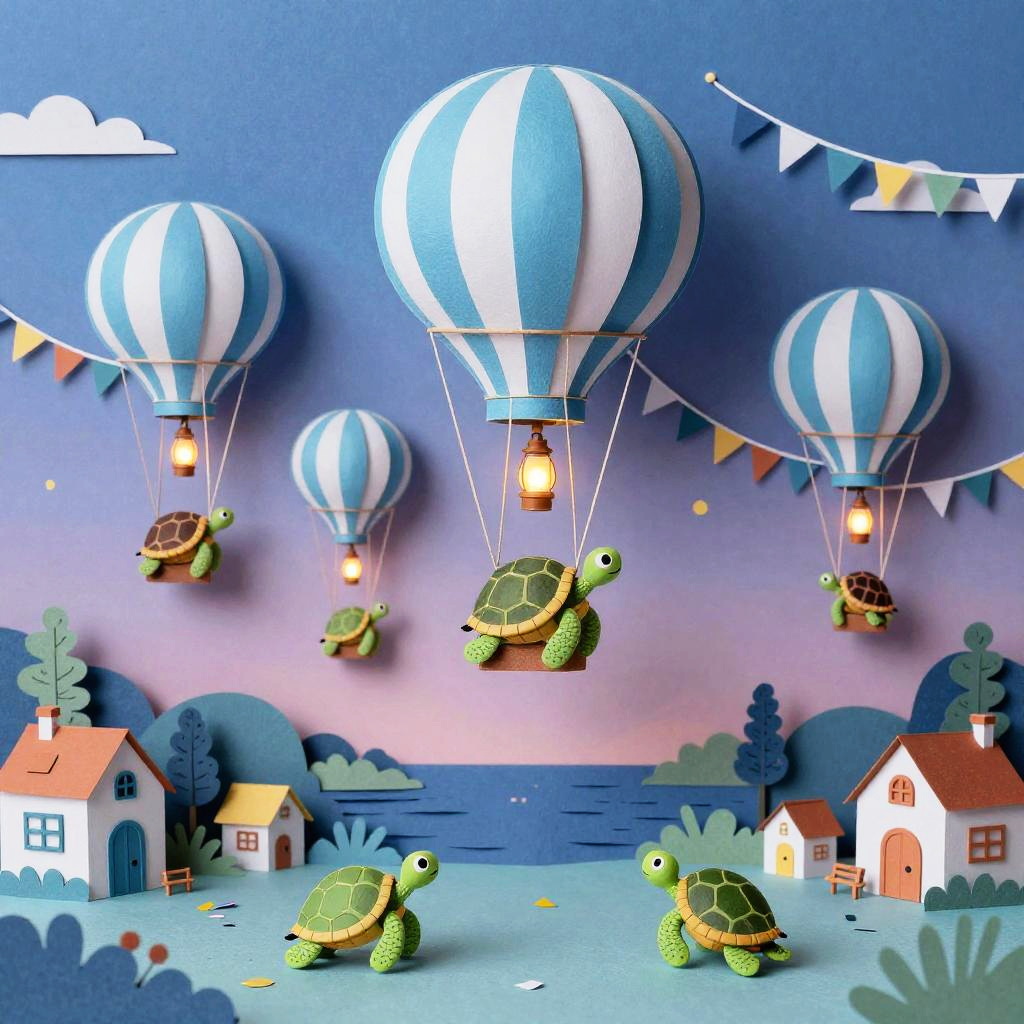 Lighthearted illustration of a cozy floating teahouse carried by a flock of lantern-birds, with curling steam like musical notes, tiny patrons sipping from mismatched cups, twinkling lanterns trailing ribbons, and scattered paper boats, in a starlit twilight sky above a sleepy town, created in paper-cut collage with soft, tactile textures, fantastical and delightful