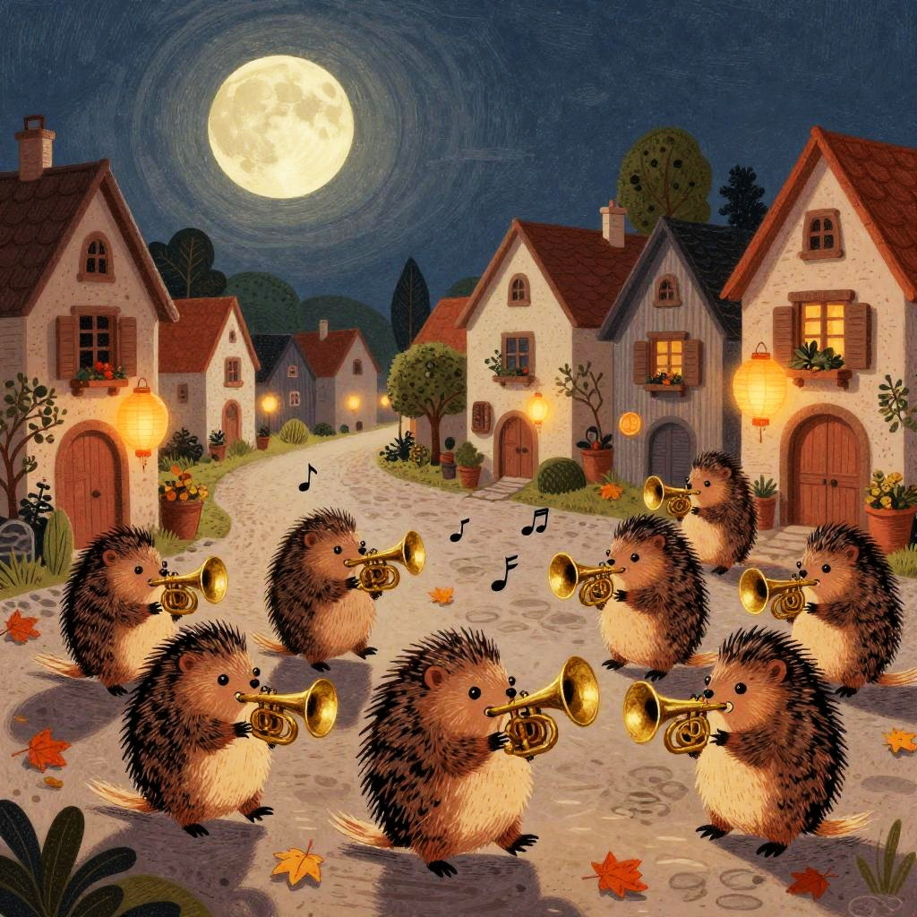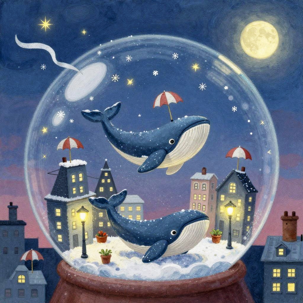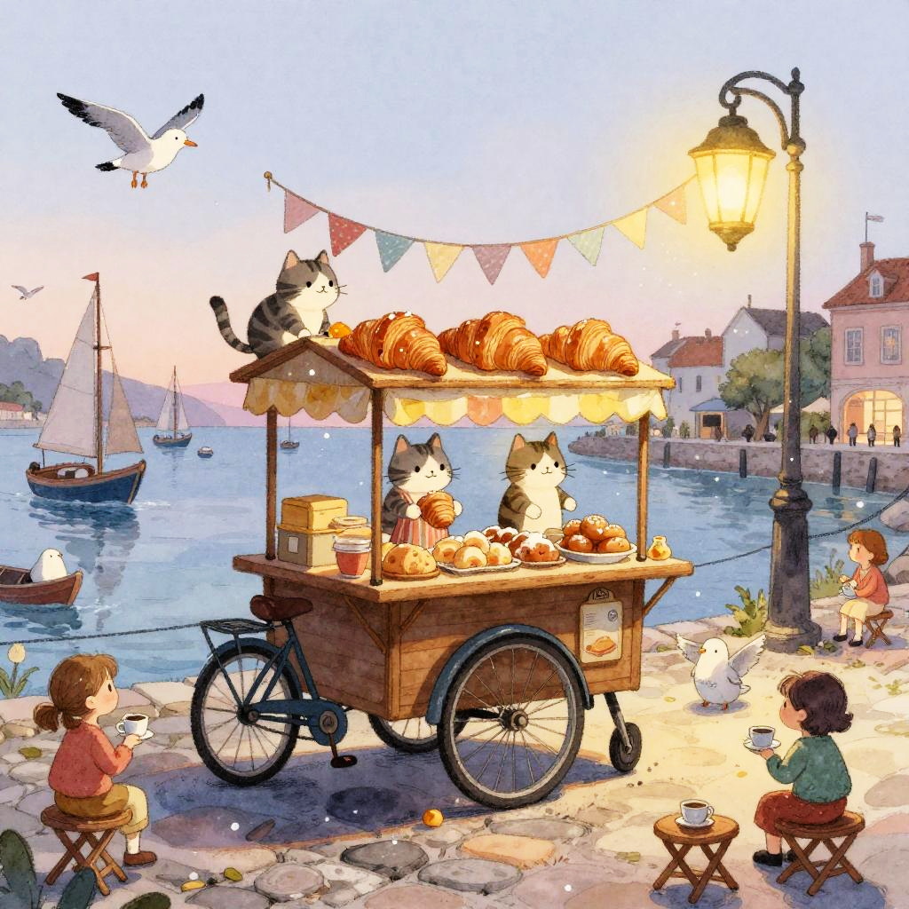 Illustration of a cozy floating teahouse in a starlit twilight sky above a sleepy town. The teahouse is carried by a flock of white lantern-birds with musical note-shaped steam. Two tiny patrons sit at a table sipping from mismatched cups. Warm lanterns hang from the teahouse, trailing glowing ribbons. Paper boats float on a textured blue surface below. The scene is created in a paper-cut collage style with soft tactile textures, evoking a fantastical and lighthearted atmosphere.