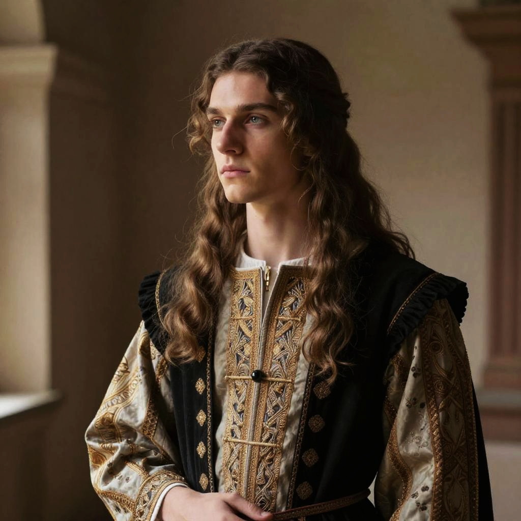 Photograph of a young man with long, wavy brown hair and fair skin, standing indoors. He wears an ornate, gold-embroidered, medieval-style shirt with black velvet sleeves. His expression is serious, and he gazes slightly to the left. The background features a dimly lit, stone-walled interior with a window to the left and wooden paneling to the right, creating a historic, castle-like atmosphere. The lighting highlights his face and upper body, casting soft shadows. The image has a dramatic, period-drama style.