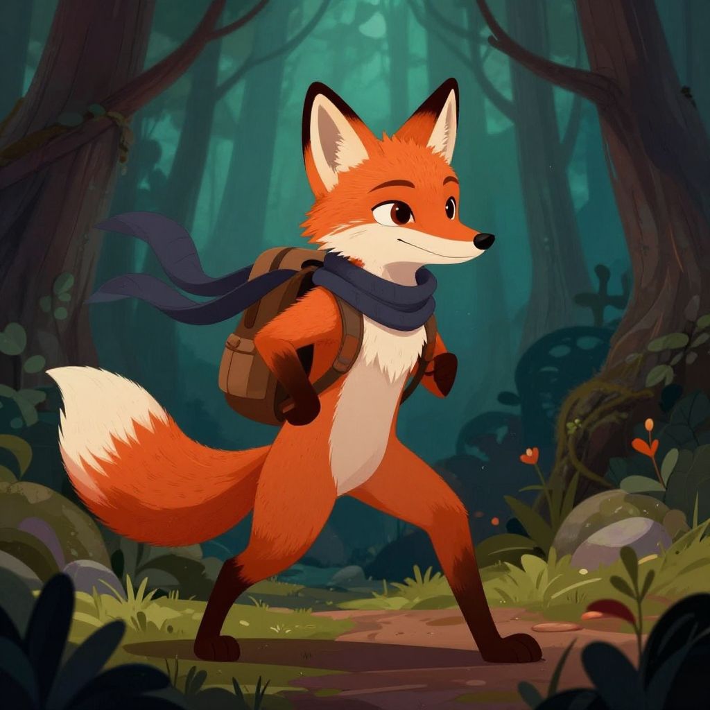 Female fox cartoon adventurer with backpack and scarf, exploring enchanted woods, dynamic pose, rich color scheme, detailed fur patterns, lively and imaginative art style