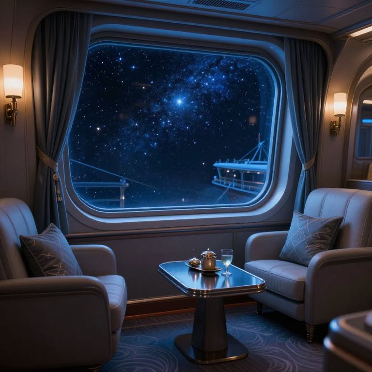 Neo-Victorian cozy room in intergalactic cruise ship, window with view of all the stars, relaxing, liminal spaces, blue light,