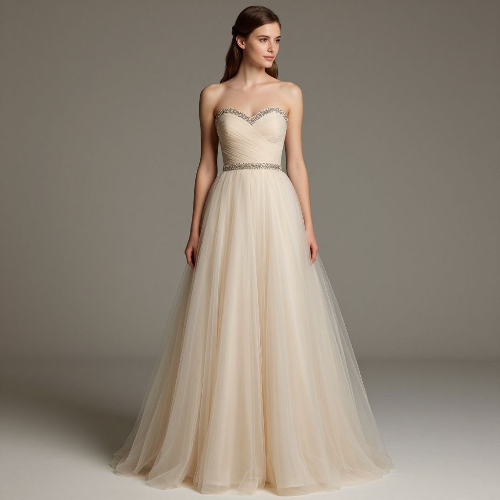Elegant woman showcasing a Pd6071 high-quality prom dress, featuring a strapless sweetheart neckline adorned with sparkling embellishments, a fitted bodice, and a flowing tulle skirt that gracefully cascades into an A-line silhouette against a neutral backdrop.