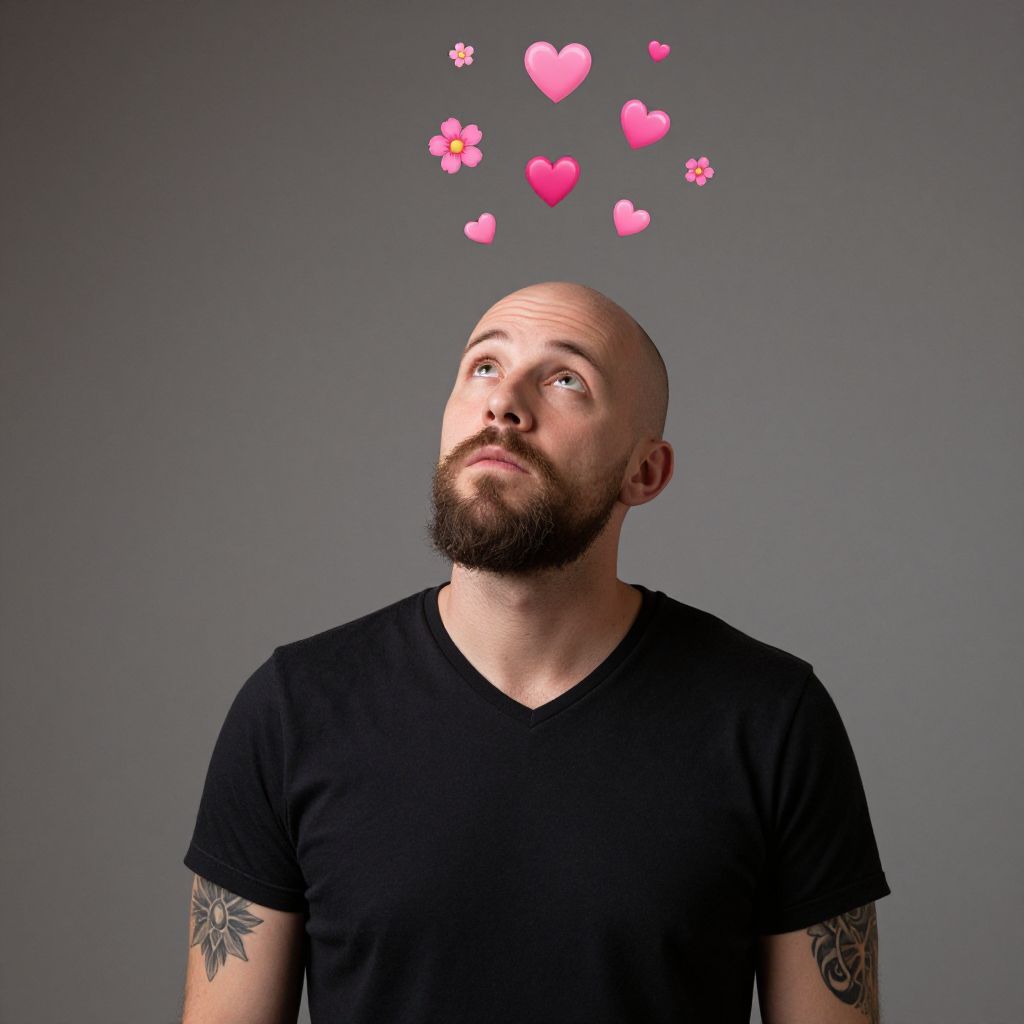 A tattooed, bald, short-bearded man in a black t-shirt gazes upwards as hearts and flowers float around his head, evoking a sense of love and admiration.