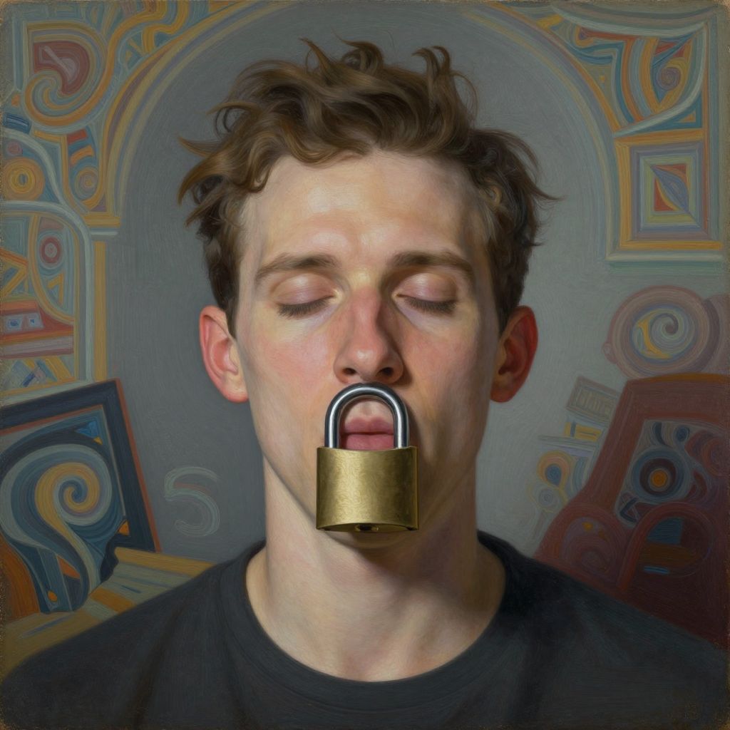 A surrealistic painting by Mark Ryden features a man with his mouth closed by a padlock, set against a muted, colorful background with intricate details and a chaotic atmosphere.