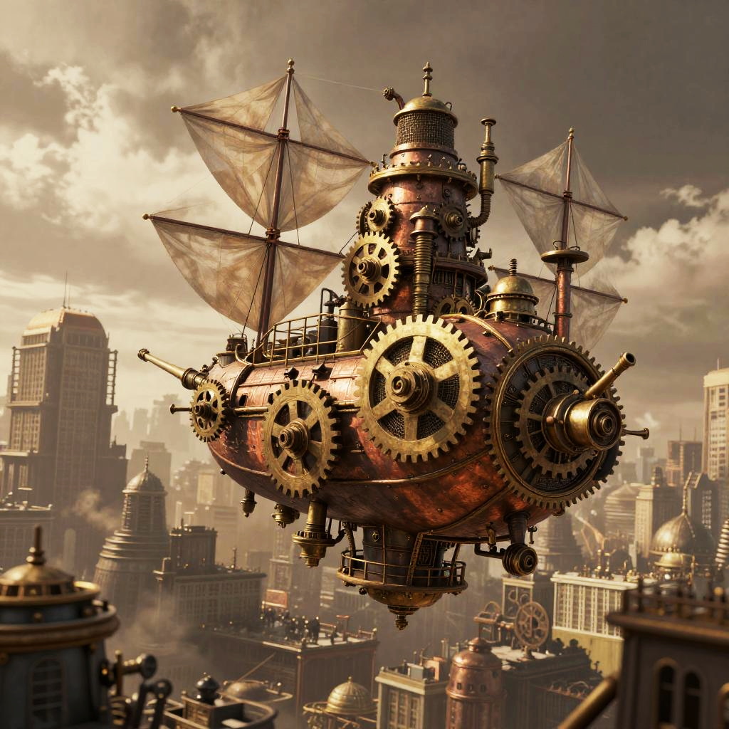Maicraf steampunk airship soaring above a sprawling industrial metropolis, intricate gears and pipes, warm sepia tones with hints of brass and copper, dynamic clouds and smoky skies, highly detailed steampunk aesthetic