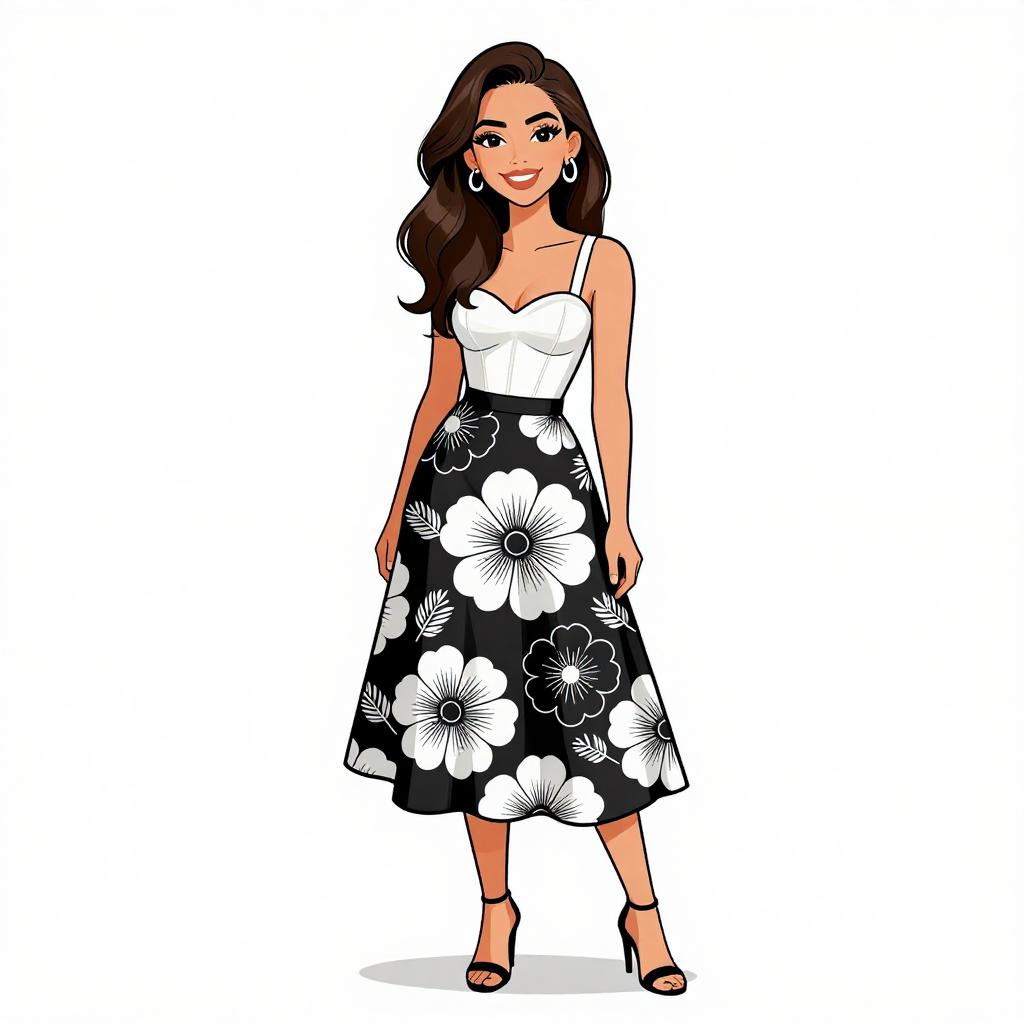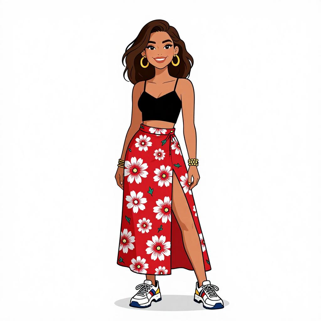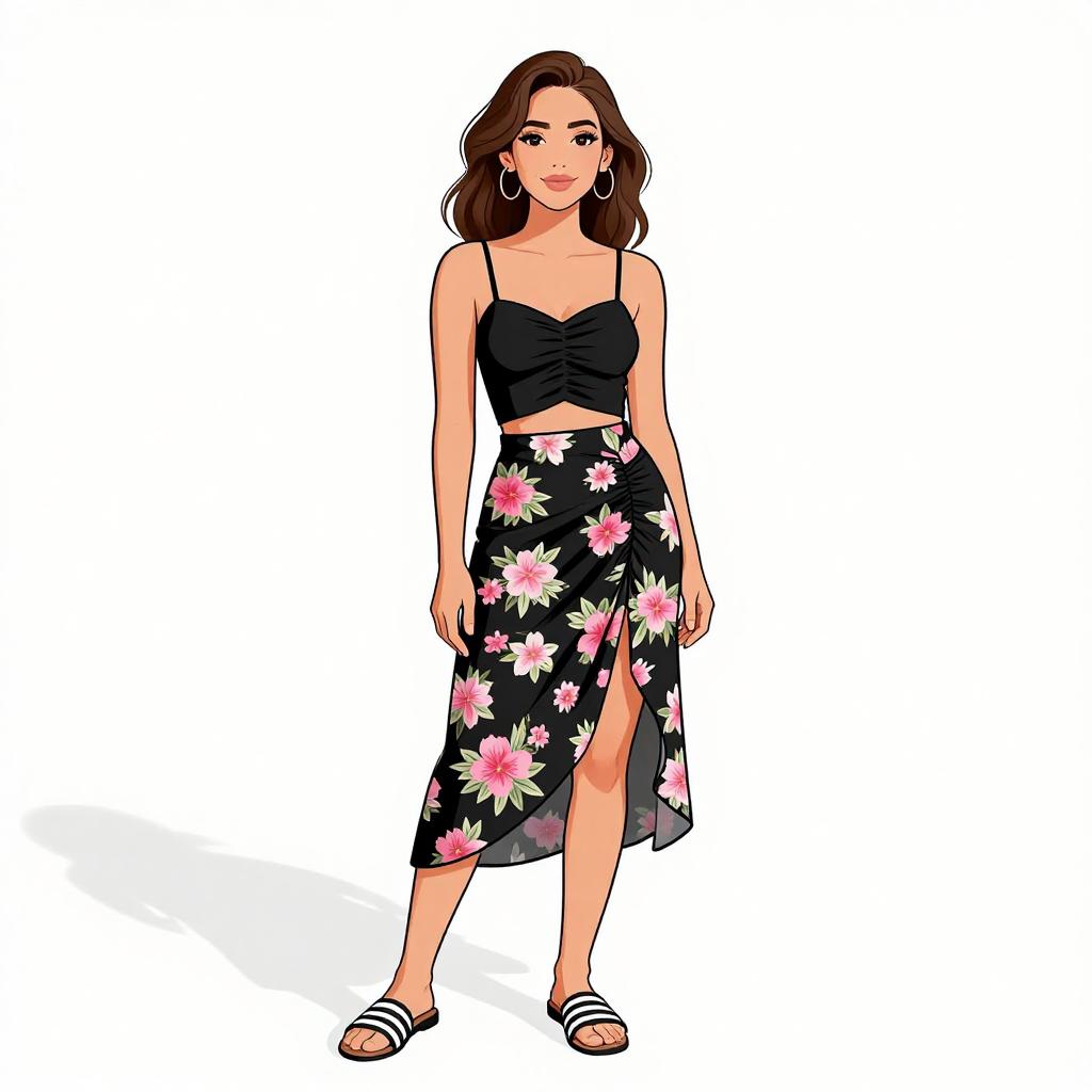 Illustration of a smiling woman with long brown hair wearing a casual summer outfit. She is dressed in a black ruched crop top with thin spaghetti straps and a black floral print midi skirt featuring pink flowers and an asymmetrical hem with gathered detail on the side. She wears flat slide sandals in black with white striped straps. The image has a white background with subtle shadowing, creating a studio effect.