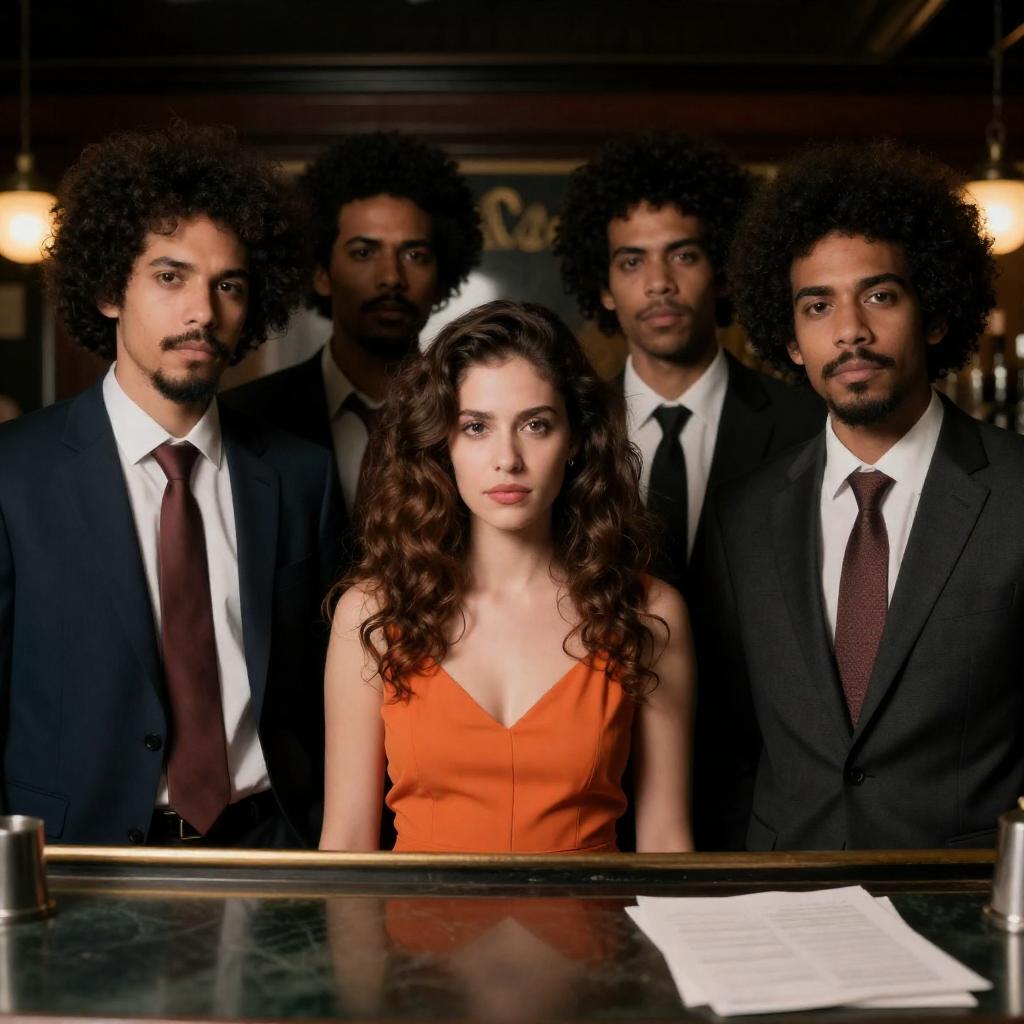 Photograph of four people in a dimly lit bar. Three men with afros and mustaches, one woman with wavy brown hair. Woman in orange dress, men in suits and ties. Woman leaning forward, men standing closely behind. Bar counter in foreground, papers on counter. Intense expressions.