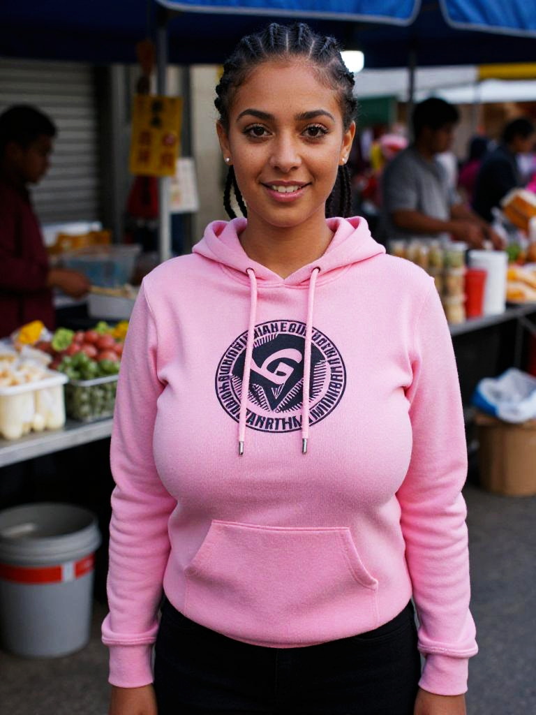 Photograph of a young South Asian woman with medium brown skin and long, braided black hair standing in front of a bustling outdoor market. She wears a light pink hoodie with a black circular logo featuring a stylized "G" and three lines, and black pants. Her large breasts are prominent under the hoodie. The background shows blurred market stalls with colorful fruits and vegetables, a closed metal shutter, and a few people. She smiles warmly at the camera. The overall image has a vibrant, slightly exaggerated color style.