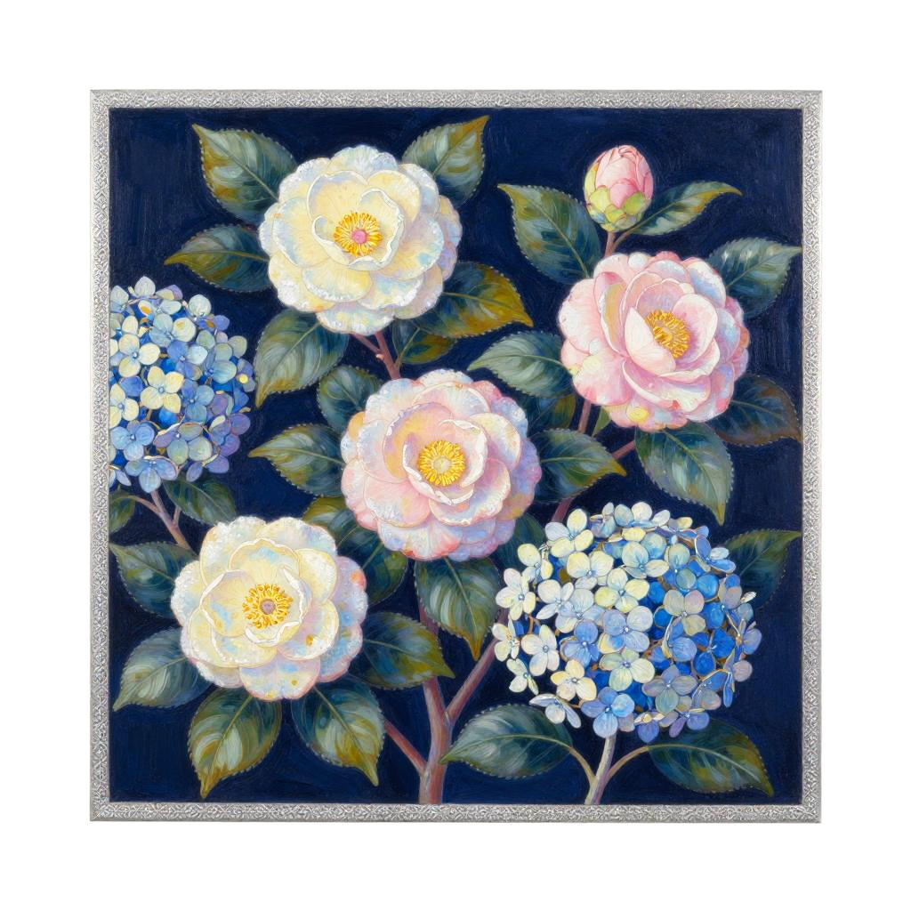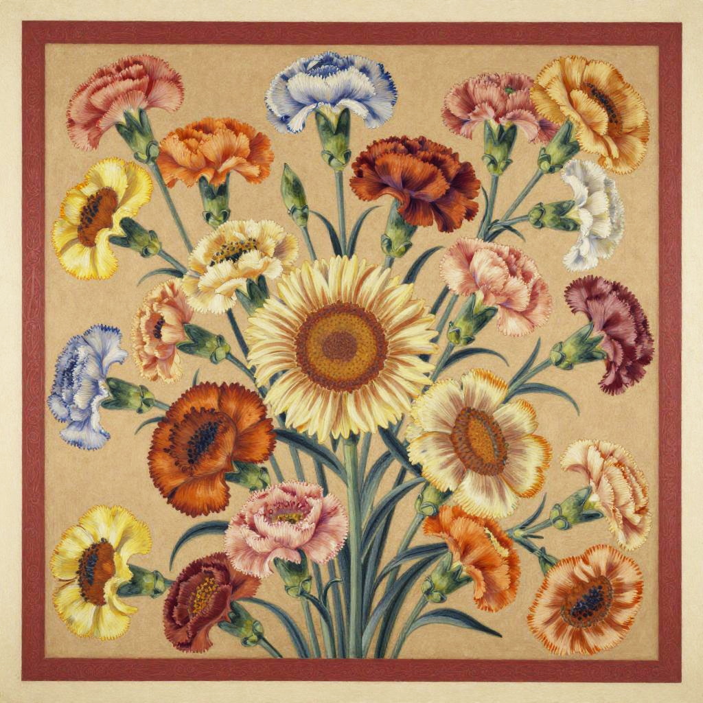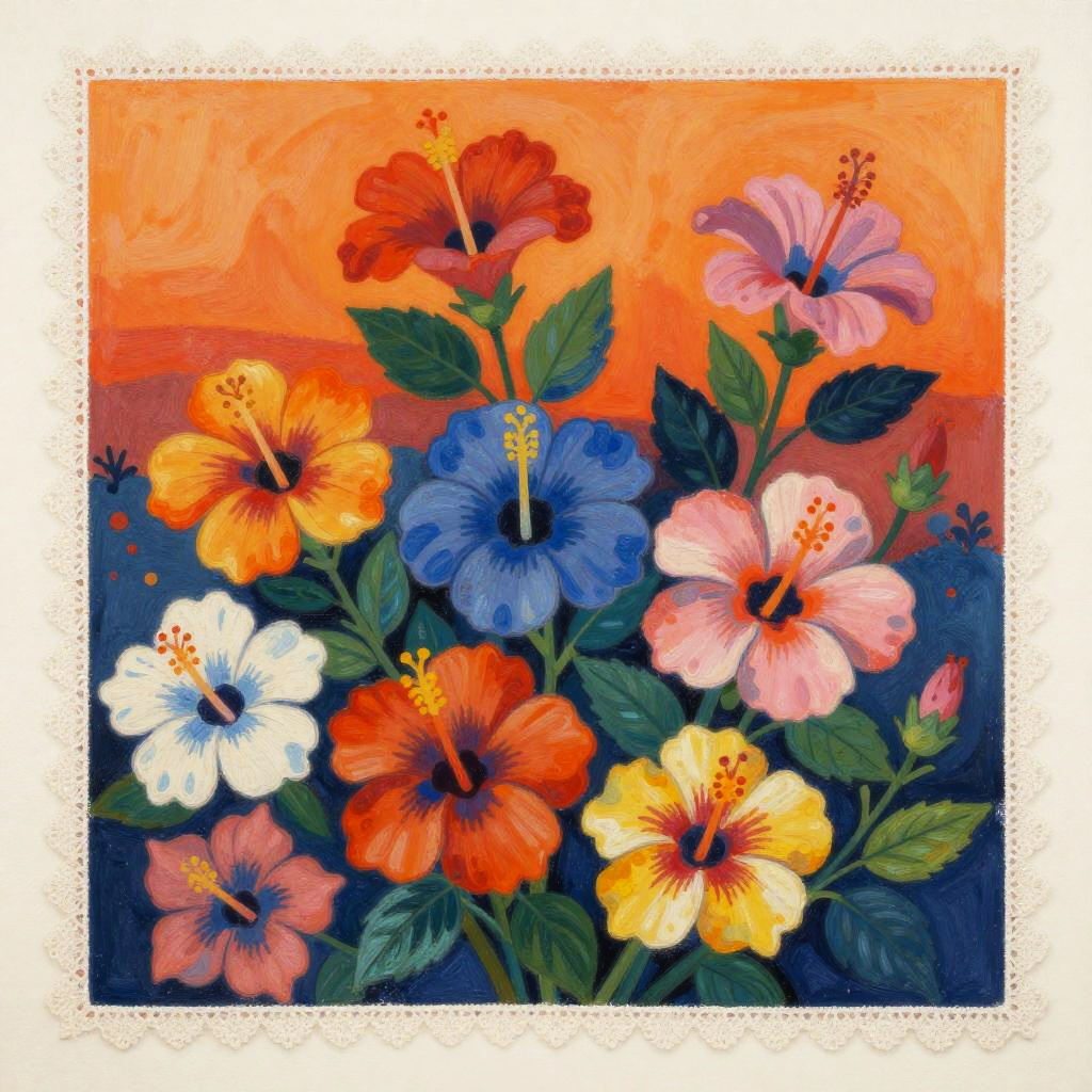 A colorful floral pattern with lots of lush hibiscus flowers in various bright hues on a sunset orange background with a delicate white lace border, inspired by Paul Gauguin, color field, in gouache detailed paintings, a storybook illustration