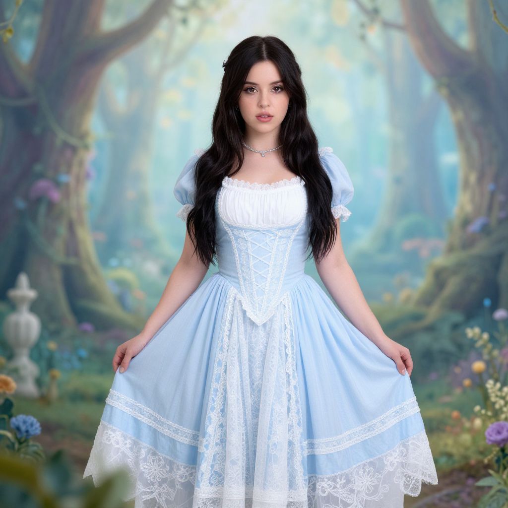 Photograph of a young woman with long brown hair, wearing a light blue Alice in Wonderland-style dress and matching bow, standing in a green, blurred