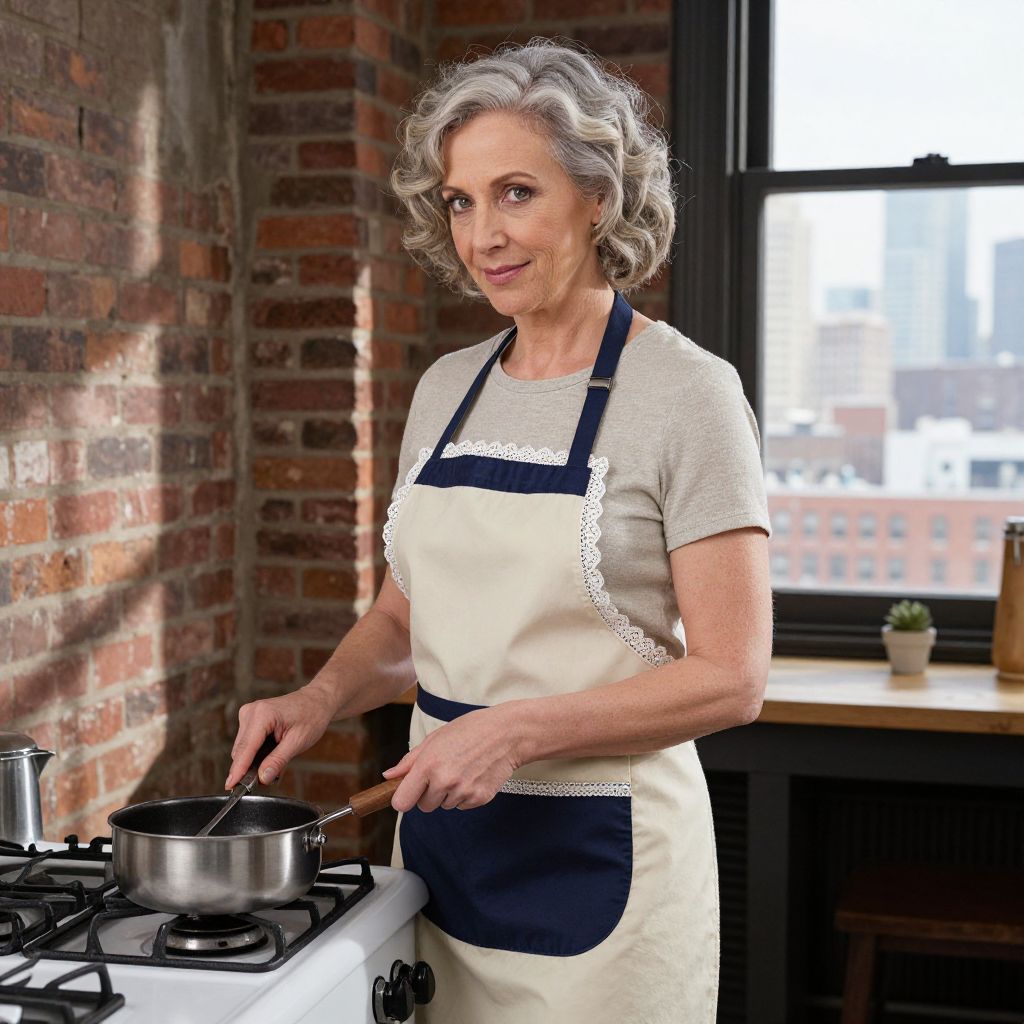 A middle-aged woman with curly gray hair and a soft smile wears an elegant apron fashion with a lace trim and navy blue accents, cooking on a gas stove in a vintage-style urban apartment kitchen with exposed brick walls and a window overlooking a city skyline, realistic detail and natural shadows