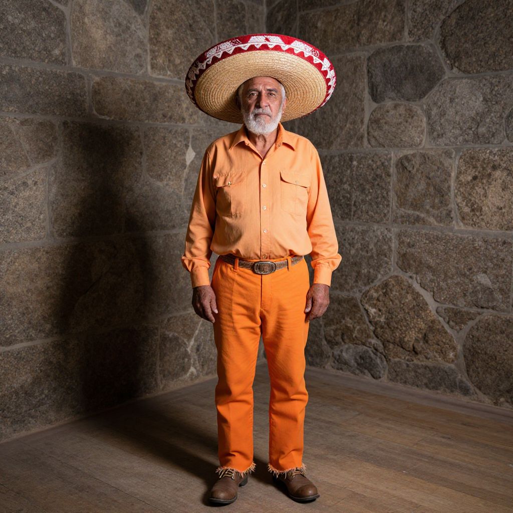 This is a photograph of an elderly man standing in a stone-walled room. He's wearing a large, straw sombrero with red and white feathers, an orange button-up shirt with rolled-up sleeves, bright orange pants with frayed hems, and brown lace-up boots. He's got a white beard and is standing with a neutral expression, casting a shadow on the wooden floor.