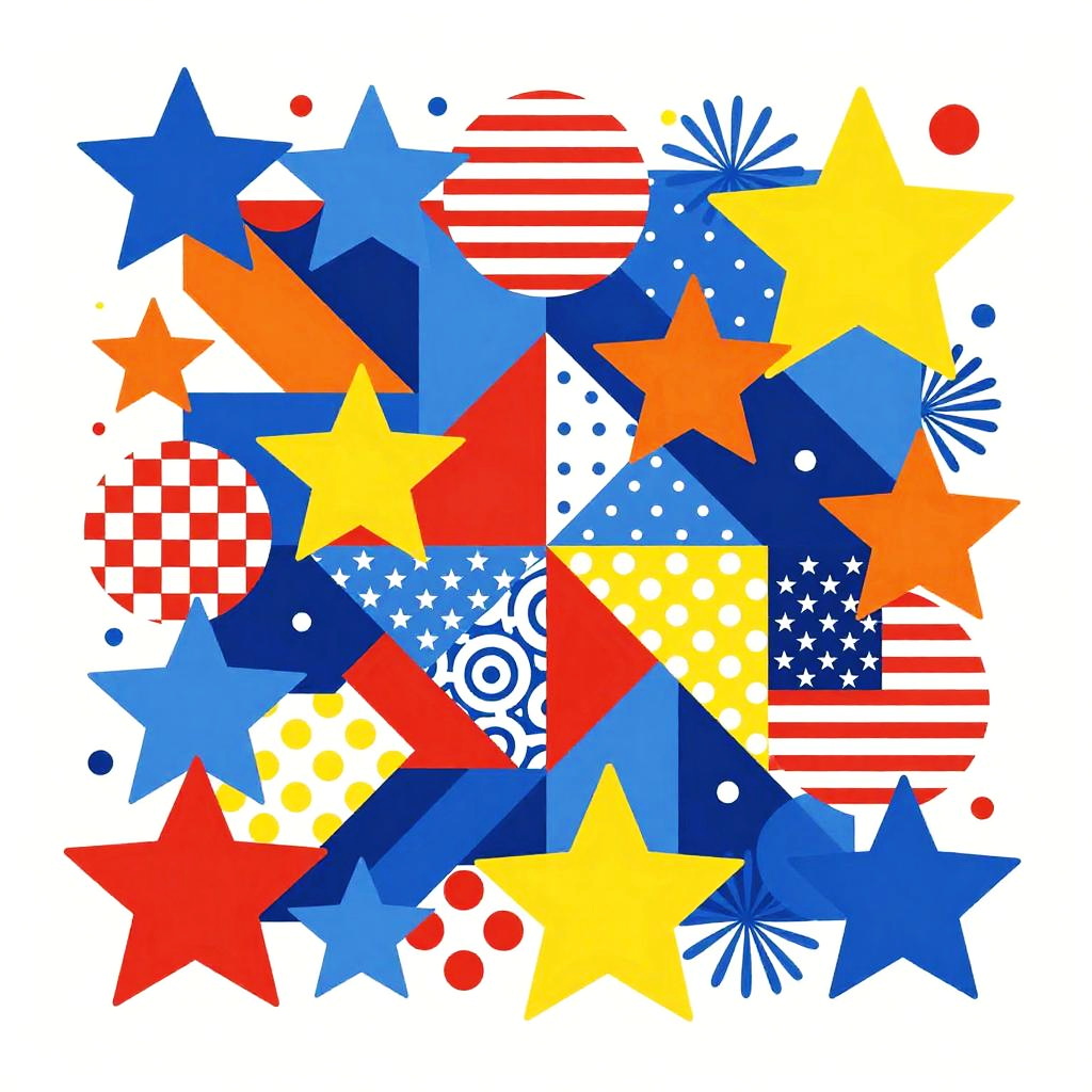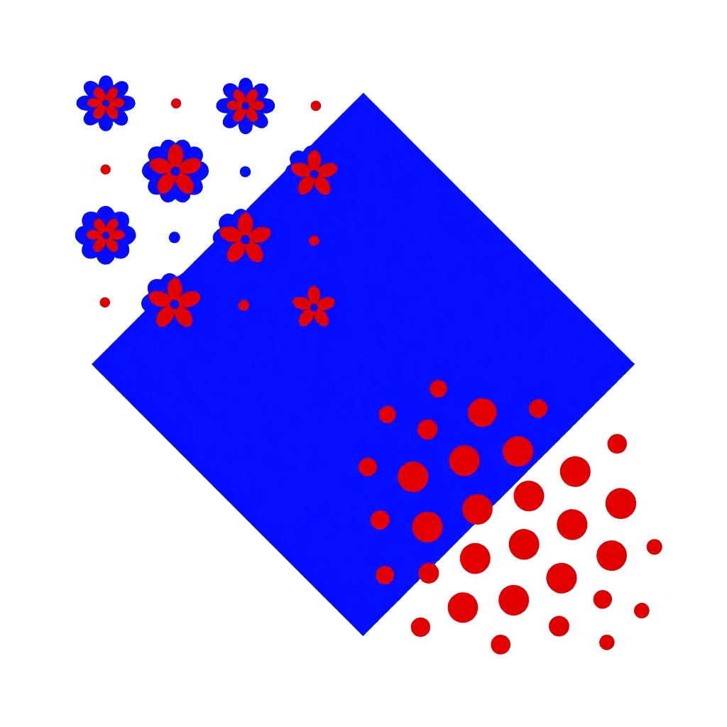 This is a digital abstract art piece featuring a large blue arrowhead shape with red and blue flower-like patterns scattered around it. The background is white, making the red and blue colors pop. The flowers and dots have a playful, almost psychedelic feel. There's a smaller section in the bottom right with a denser cluster of red dots and flowers.
