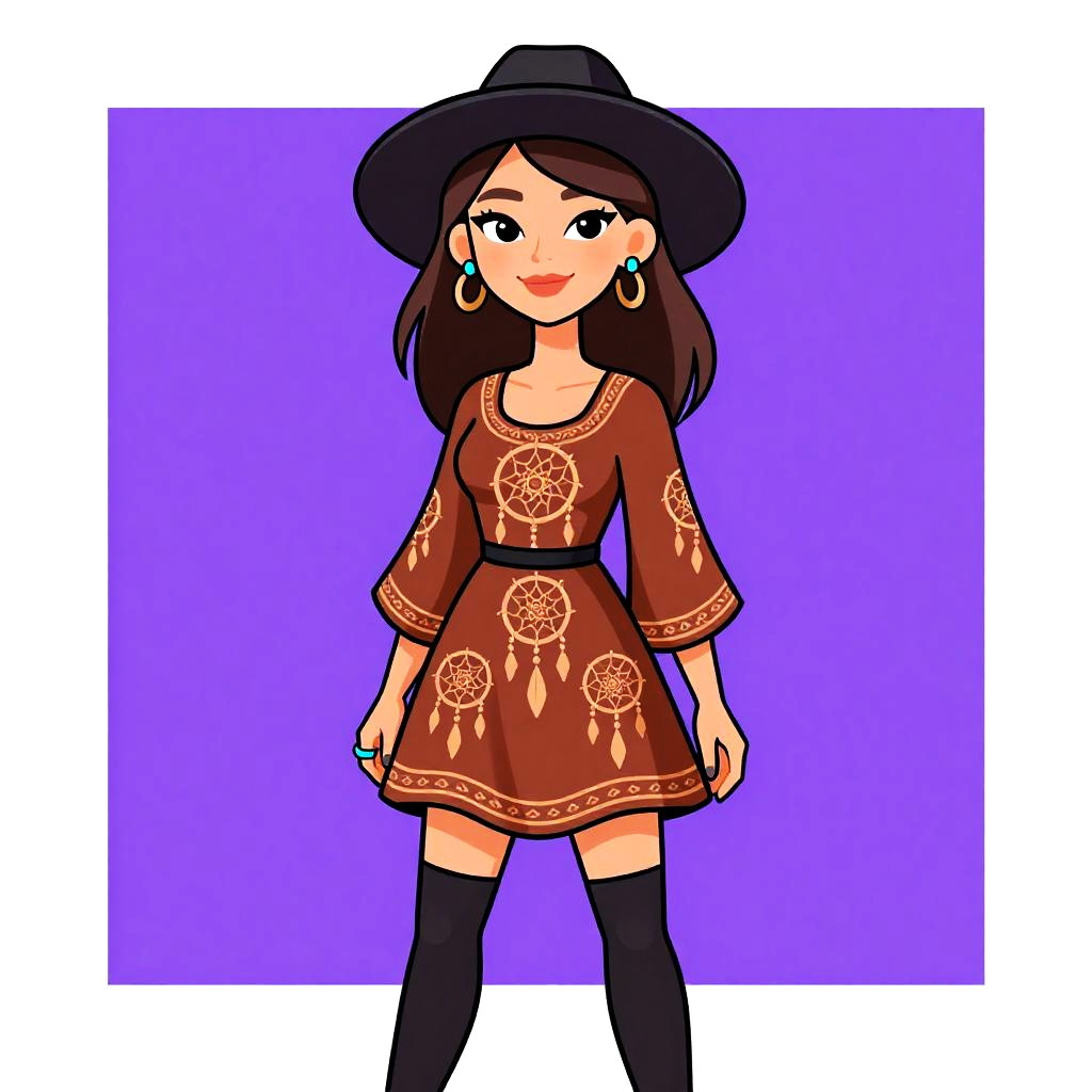 This digital illustration features a young woman with fair skin and brown hair, wearing a black wide-brimmed hat and large hoop earrings. She has a cheerful expression with bright red lips and dark eyes. She is dressed in a brown, short-sleeved dress adorned with intricate, white dreamcatcher patterns across the chest and skirt. She also wears black thigh-high socks. The background is a solid, vibrant purple square, emphasizing the character. The art style is cartoonish with bold, clean lines and flat colors, giving it a playful and modern look.