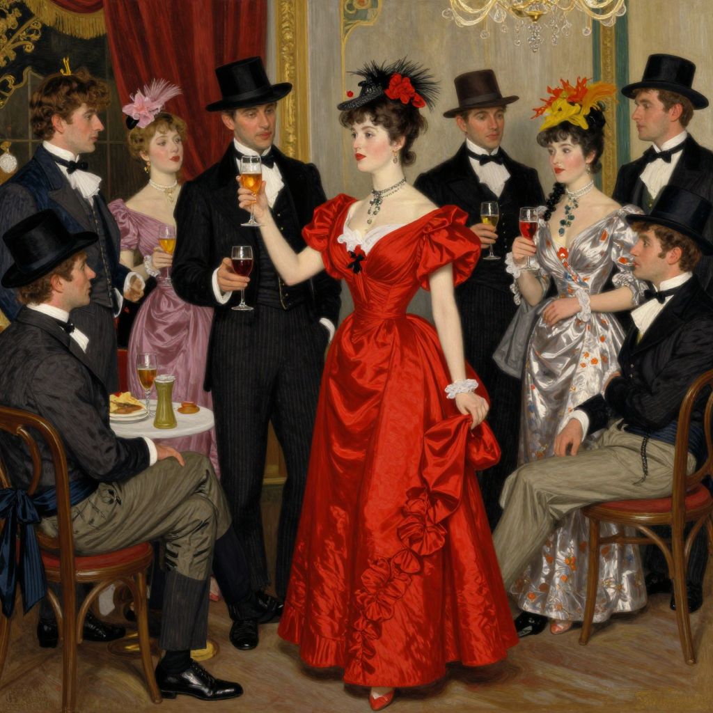 This is a detailed, realistic oil painting depicting a Victorian-era social gathering. Eight people, six men and two women, are dressed in elaborate 19th-century attire. The central woman wears a vivid red, off-shoulder gown with puffed sleeves and a black feathered hat, holding a wine glass. Surrounding her are men in black tailcoats and top hats, some with colorful feathered hats. One woman wears a lavender dress and another a silver gown with floral patterns. They are seated and standing around a table with a glass of wine and a plate of pastries. The background features ornate wallpaper and a chandelier.
